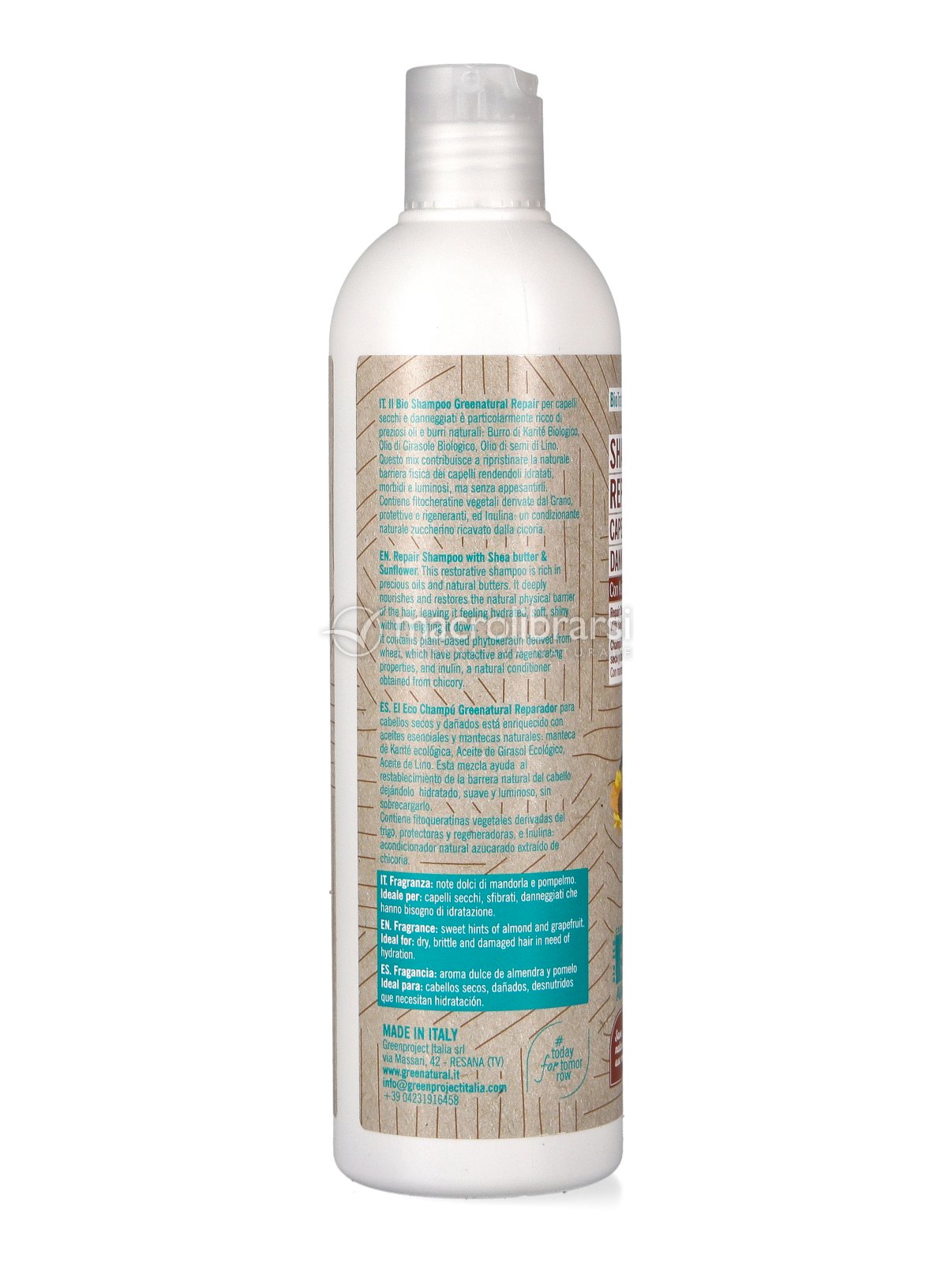 Lo Shampoo Greenatural Repair è ricco di preziosi oli e burri naturali come il burro di Karité biologico, olio di Girasole biologico e olio di semi di Lino, un mix che contribuisce a ripristinare la naturale barriera fisica dei capelli rendendoli idratati, morbidi e luminosi, ma senza appesantirli.