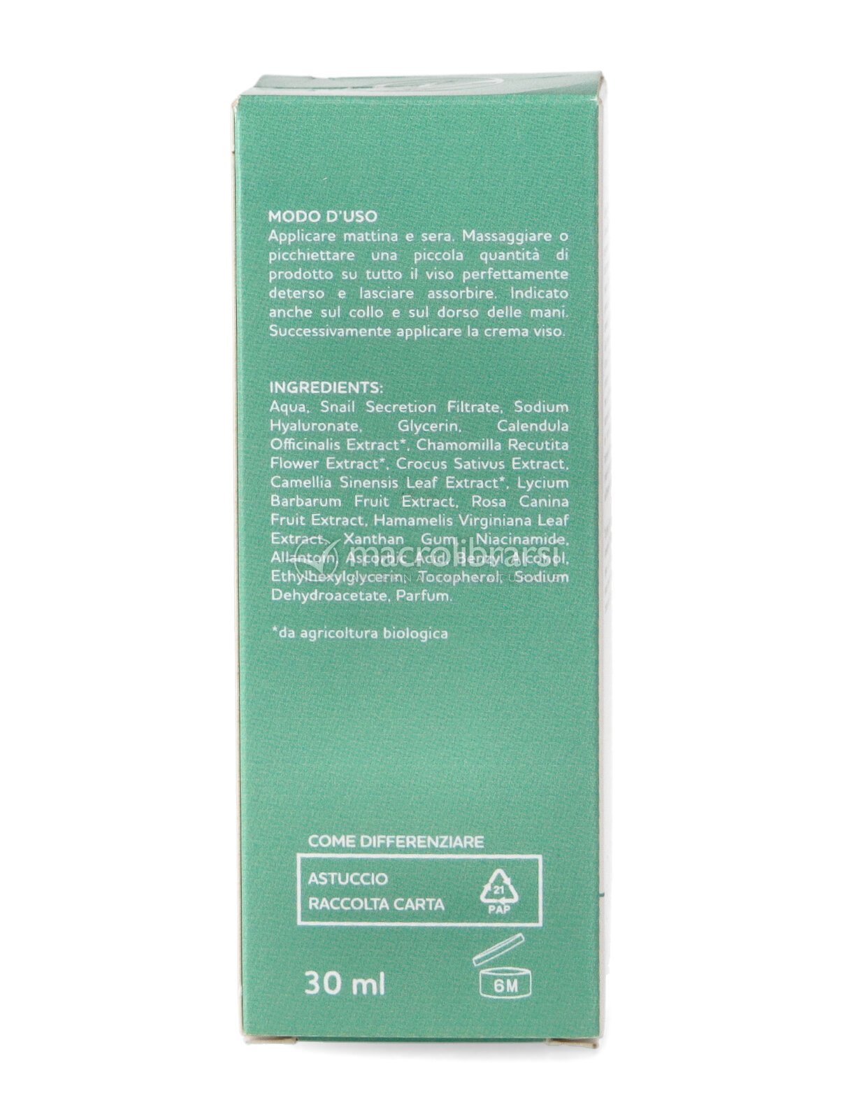 Note | La bava di lumaca utilizzata per la formulazione dei prodotti BisouBio è ottenuta da una lavorazione interamente manuale, che segue un procedimento artigianale che non provoca stress e rispetta le chiocciole di lumaca. |