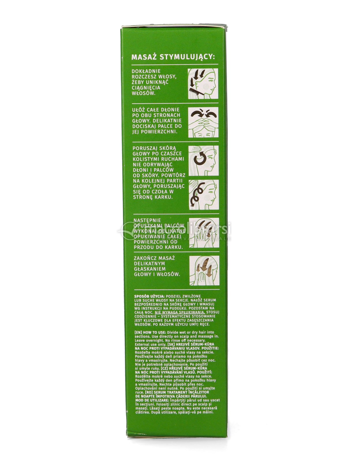 Dividere i capelli asciutti o umidi in sezioni. Applicare il siero direttamente sul cuoio capelluto e massaggiare delicatamente, seguendo le istruzioni sulla confezione. Lasciare agire per tutta la notte, senza risciacquare.