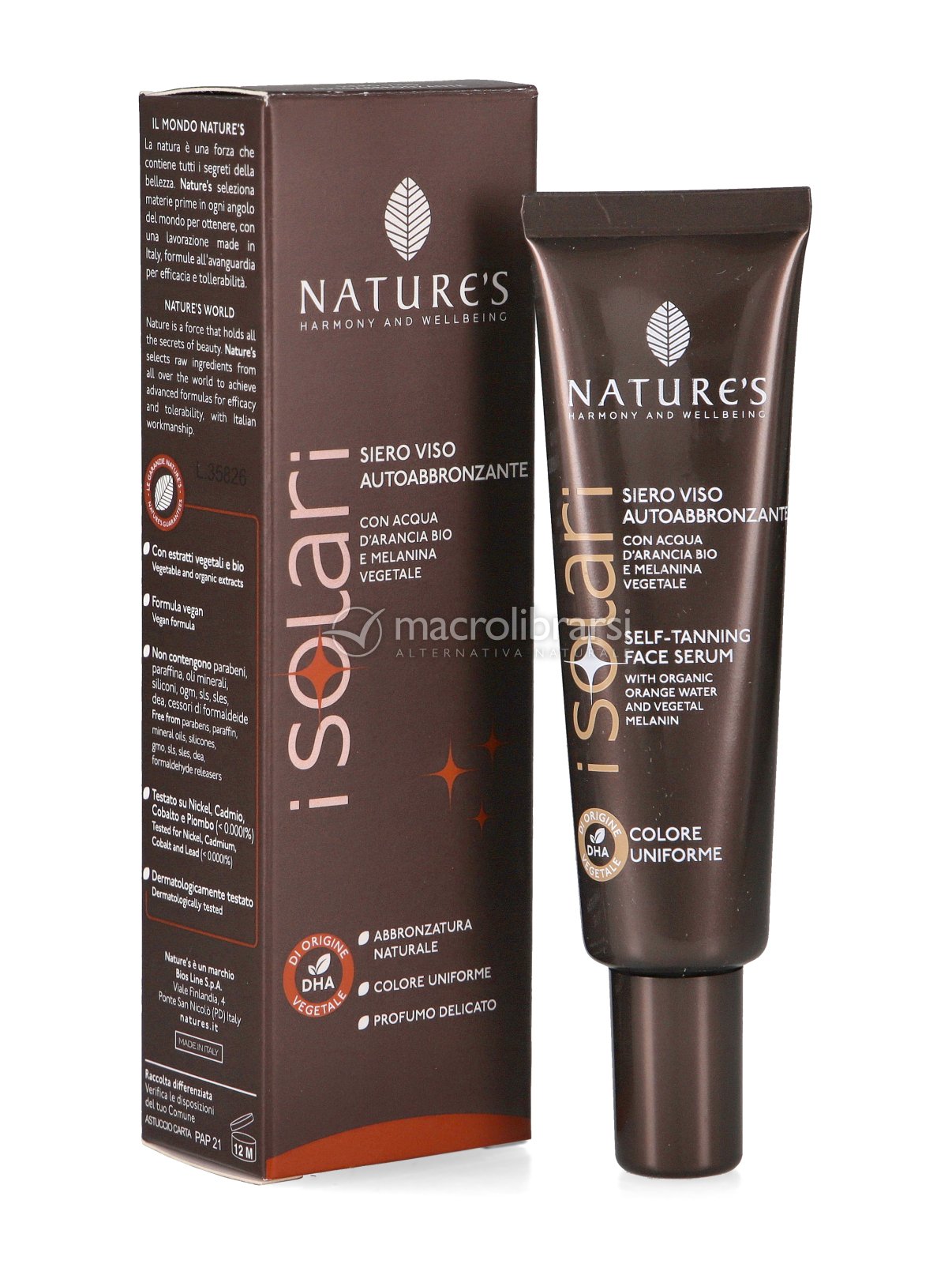 Il Siero Viso Autoabbronzante della linea iSolari di Nature's contiene DHA di origine vegetale, con funzione auto-abbronzante e acido laluronico, idratante e anti-age.