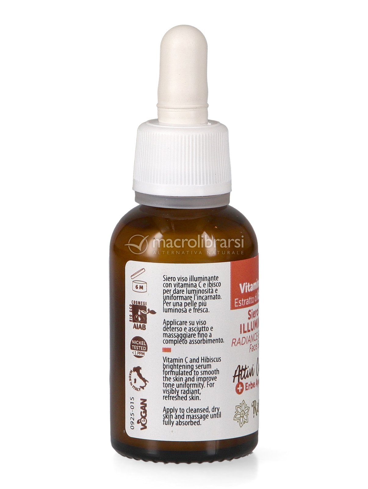 Siero Viso Illuminante Vitamina C + Ibisco di Rasayana è l’attivo cosmetico ideale per migliorare la luminosità della pelle: la spiccata azione antiossidante della Vitamina C stabilizzata 2%, che contrasta la formazione di radicali liberi, è potenziata dall’estratto di Ibisco 1%, pianta ayurvedica proage e ricca di antiossidanti.