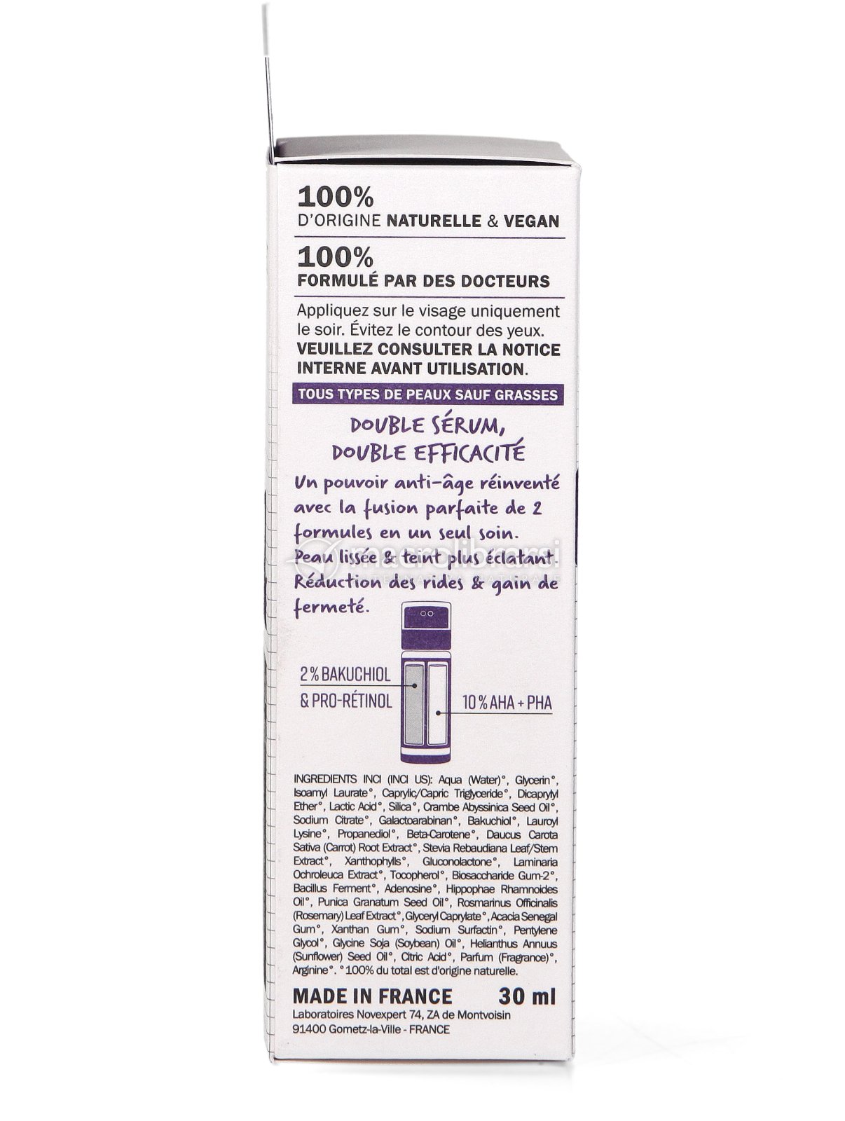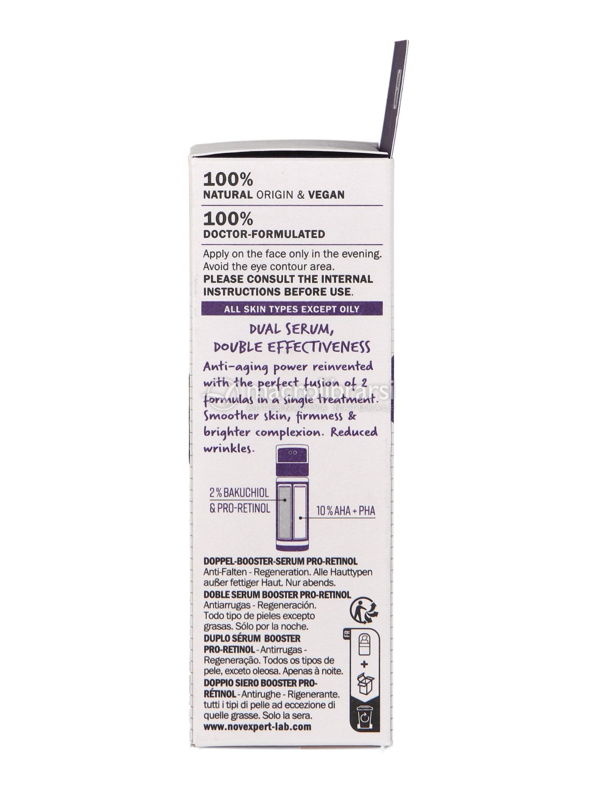 Double Serum Booster Pro-Retinol ha una doppia formulazione che unisce 3 complessi anti-età: Pro-Retinolo, Bakuchiol (Retinolo simile) e 2 acidi dolci della frutta (AHA e PHA).