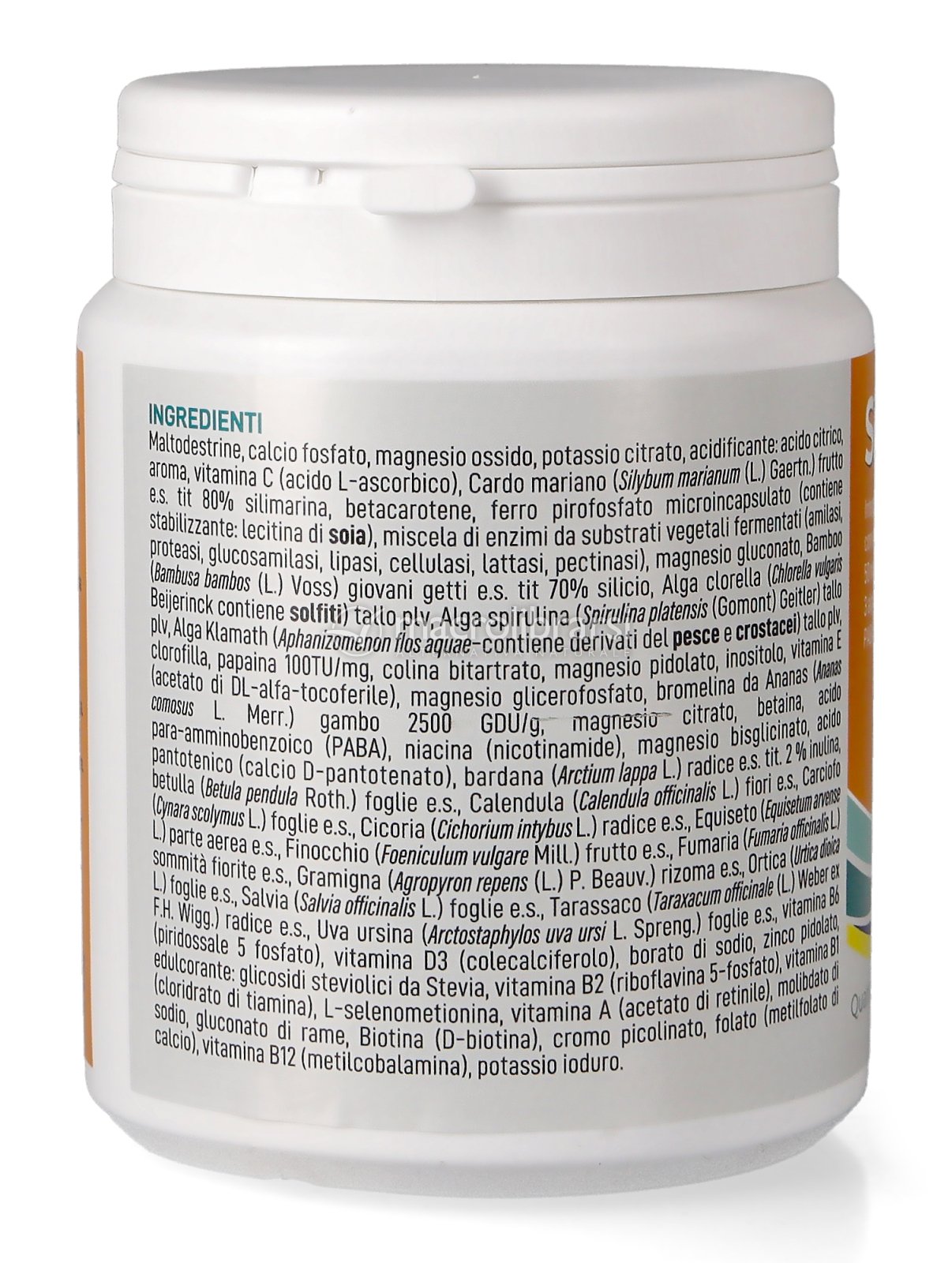 Maltodestrine, calcio fosfato, magnesio ossido, potassio citrato, acidificante: acido citrico, aroma, vitamina C (acido L-ascorbico), Cardo mariano (Silybum Marianum (L.) Gaertn.) frutto e.s. tit 80% Silimarina, betacarotene, ferro pirofosfato microincapsulato (contiene stabilizzante: lecitina di soia), miscela di enzimi da substrati vegetali fermentati (Amilasi, proteasi, Glucosamilasi, Lipasi, Cellulasi, Lattasi, Pectinasi), magnesio gluconato, Bamboo (Bambusa bambos (L.) Voss) giovani getti e.s. tit 70% silicio, Alga clorella (Chlorella vulgaris Beijerinck contiene solfiti) tallo plv, Alga spirulina (Spirulina platensis (Gomont) Geitler) tallo plv, Alga Klamath (Aphanizomenon flos aquae-contiene derivati del pesce e crostacei) tallo plv, clorofilla, papaina 100TU/mg, colina bitartrato, magnesio pidolato, inositolo, vitamina E (acetato di DL-alfa-tocoferile), magnesio glicerofosfato, Bromelina da Ananas (Ananas comosus L. Merr.) gambo 2500 GDU/g, magnesio citrato, betaina, acido para-amminobenzoico (PABA), niacina (Nicotinamide), Magnesio Bisglicinato, acido pantotenico (Calcio D-pantotenato), bardana (Arctium lappa L.) radice e.s. tit. 2 % inulina, betulla (Betula pendula Roth.) foglie e.s., Calendula (Calendula officinalis L.) fiori e.s., Carciofo (Cynara scolymus L.) foglie e.s., Cicoria (Cichorium intybus L.) radice e.s., Equiseto (Equisetum arvense L.) parte aerea e.s., Finocchio (Foeniculum vulgare Mill.) frutto e.s., Fumaria (Fumaria officinalis L.) sommità fiorite e.s., Gramigna (Agropyron repens (L.) P. Beauv.) rizoma e.s., Ortica (Urtica dioica L.) foglie e.s., Salvia (Salvia officinalis L.) foglie e.s., Tarassaco (Taraxacum officinale (L.) Weber ex F.H. Wigg.) radice e.s., Uva ursina (Arctostaphylos uva ursi L. Spreng.) foglie e.s., vitamina B6 (Piridossale 5 fosfato), vitamina D3 (colecalciferolo), borato di sodio, zinco pidolato, edulcorante: glicosidi steviolici da Stevia, vitamina B2 (riboflavina 5-fosfato), vitamina B1 (cloridrato di tiamina), L-selenometionina, vitamina A (Acetato di retinile), molibdato di sodio, gluconato di rame, Biotina (D-biotina), cromo picolinato, folato (Metilfolato di calcio), vitamina B12 (Metilcobalamina), potassio ioduro.
