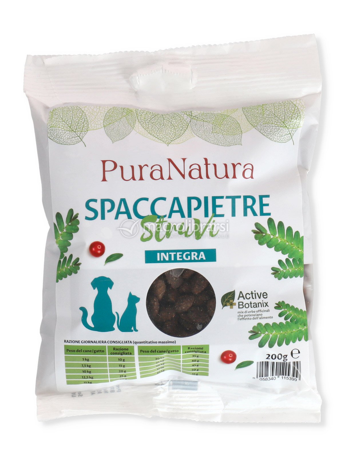 Spaccapietre Struvì di Pura Natura è uno snack naturale pensato per supportare, in modo delicato e quotidiano, il benessere del sistema renale e del tratto urinario di cani e gatti adulti.