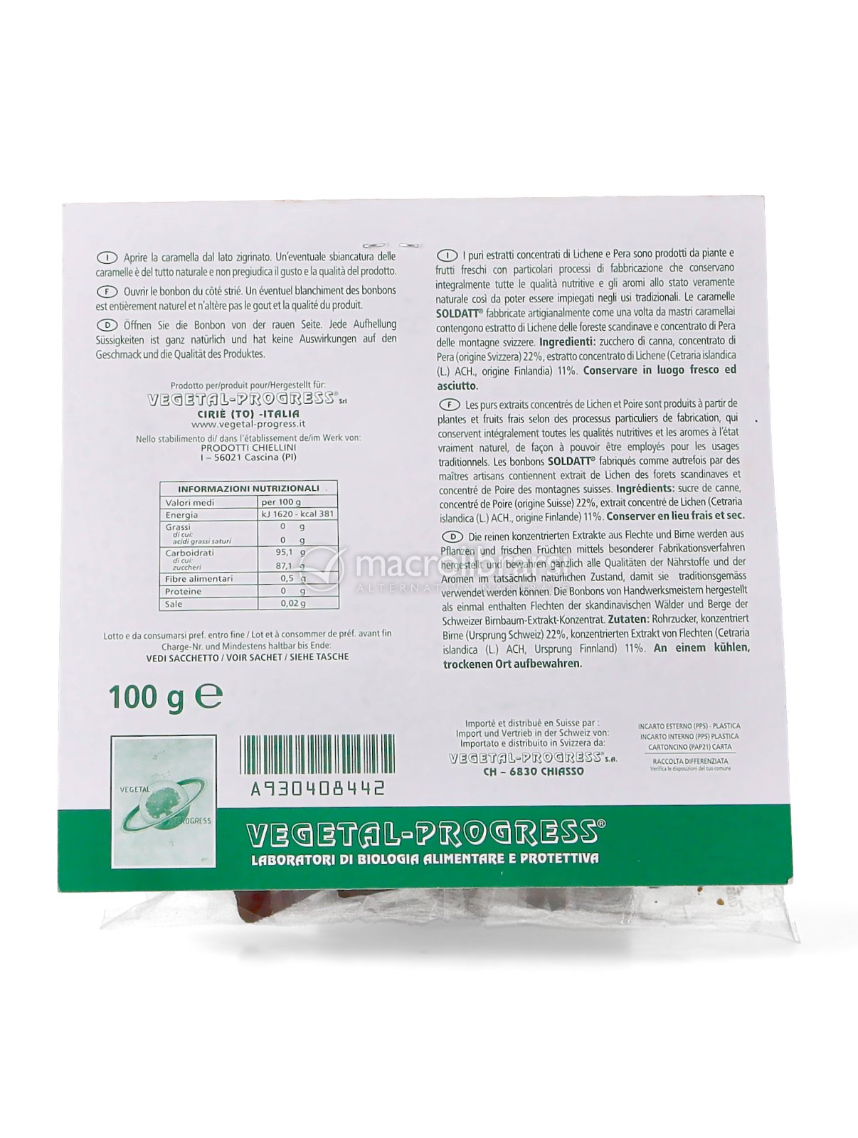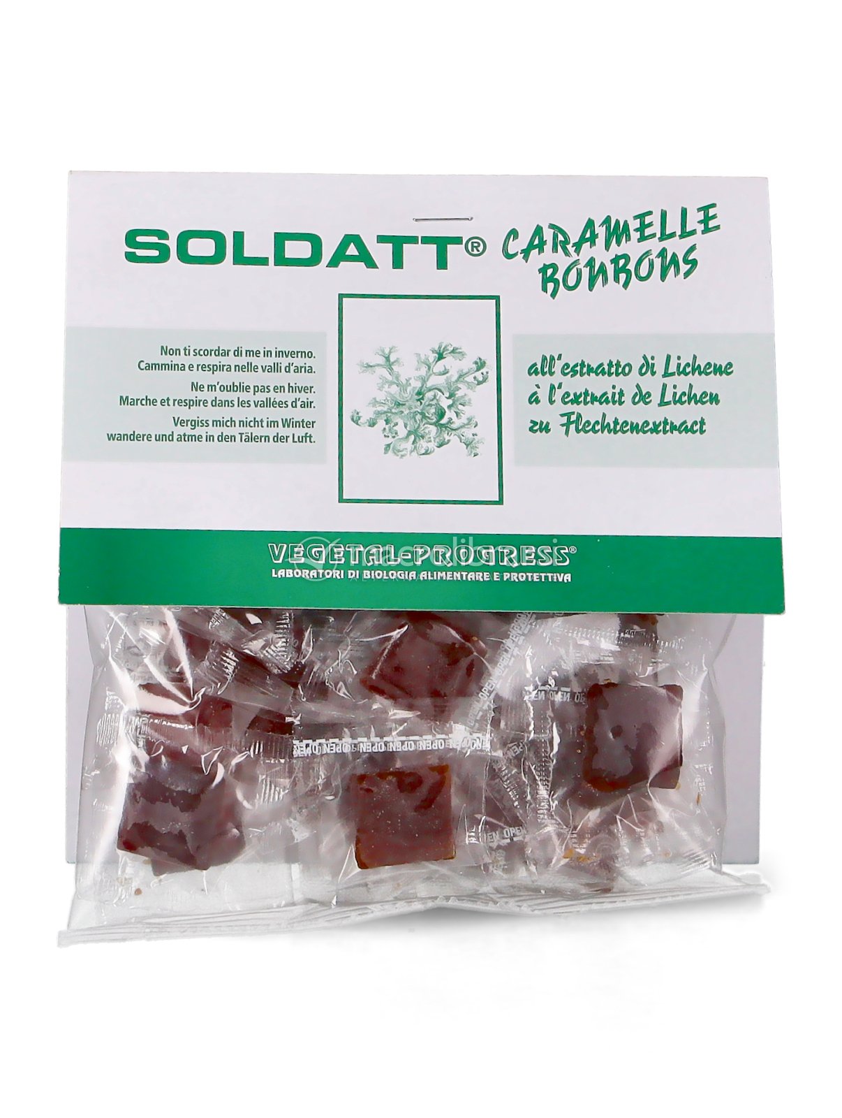 Le caramelle Soldatt, realizzate artigianalmente come una volta da maestri caramellai, contengono estratto di lichene delle foreste scandinave e concentrato di pera delle montagne svizzere certificati da agricoltura biologica.