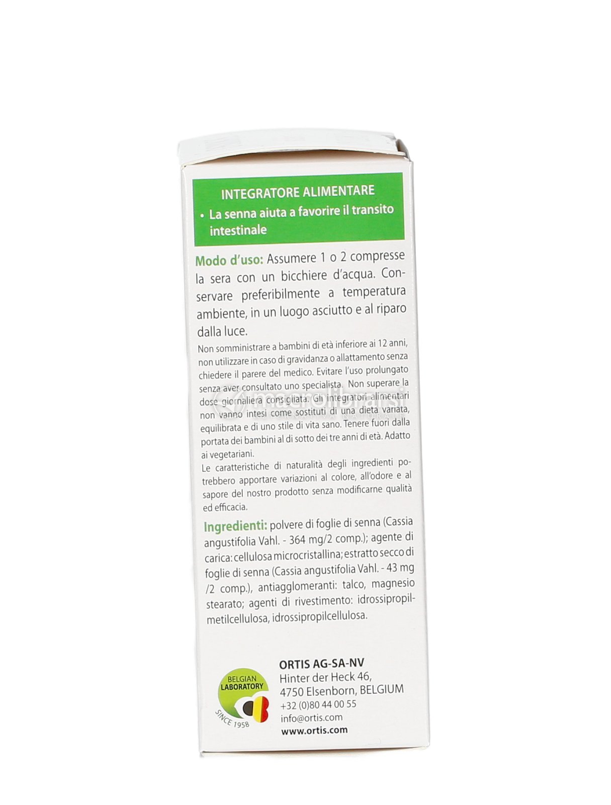 Polvere di foglie di senna (Cassia angustifolia Vahl. - 364 mg/2 comp.); agente di carica: cellulosa microcristallina; estratto secco di foglie di senna (Cassia angustifolia Vahl. - 43 mg /2 comp.), antiagglomeranti: talco, magnesio stearato; agenti di rivestimento: idrossipropilmetilcellulosa, idrossipropilcellulosa.