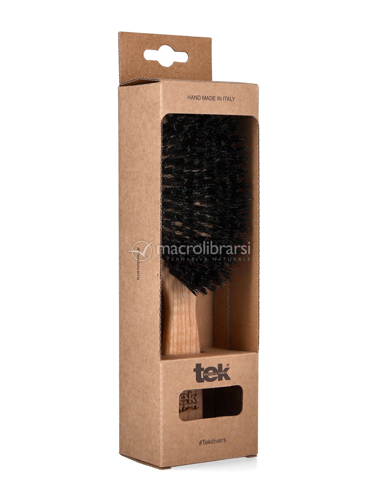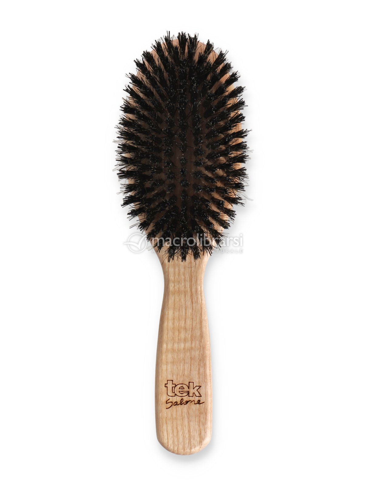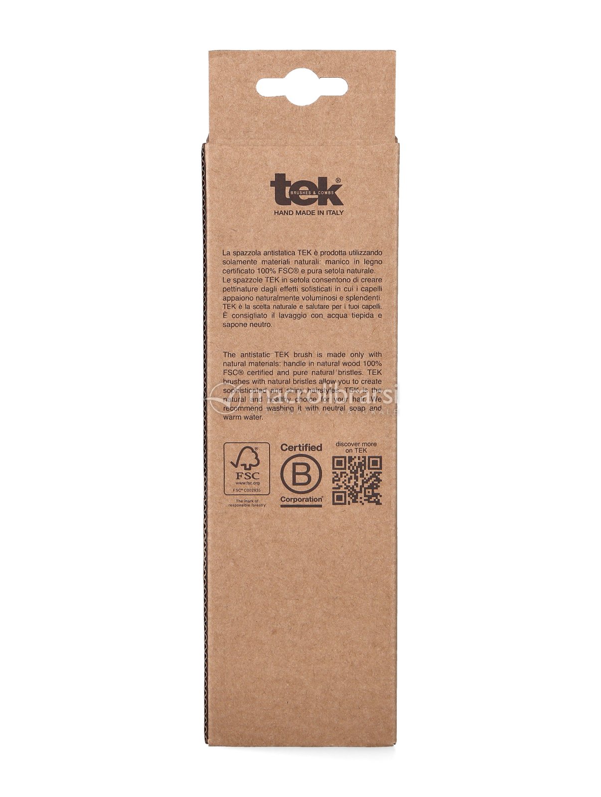 Grazie alla setolatura naturale, questa spazzola ovale TEK riduce l'effetto elettrostatico e consente di lucidare e dare volume ai capelli senza strapparli.