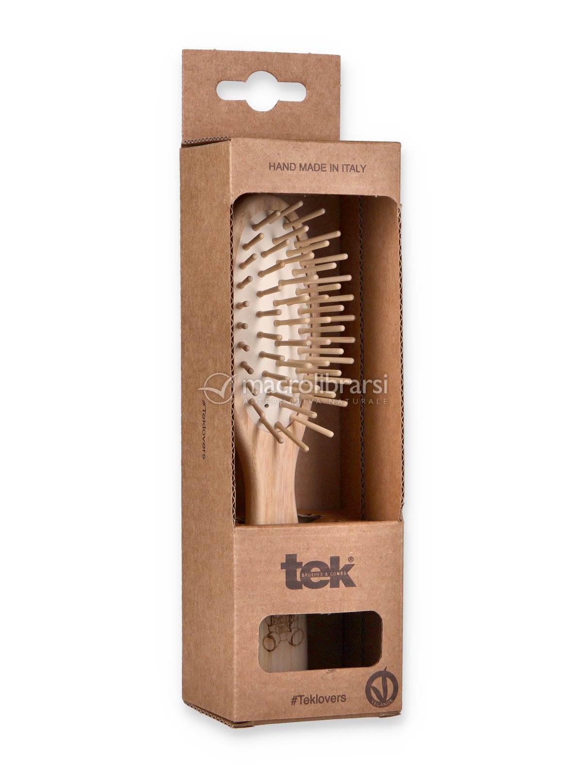 Ogni componente è studiato per offrire una spazzolatura delicata: il manico è trattato con cere e oli vegetali, i dentini sono in legno di carpino naturale, mentre la pneumatica bianca in pura gomma presenta un piccolo foro che permette alla spazzola di respirare, migliorando così l'effetto massaggiante sulla cute.
