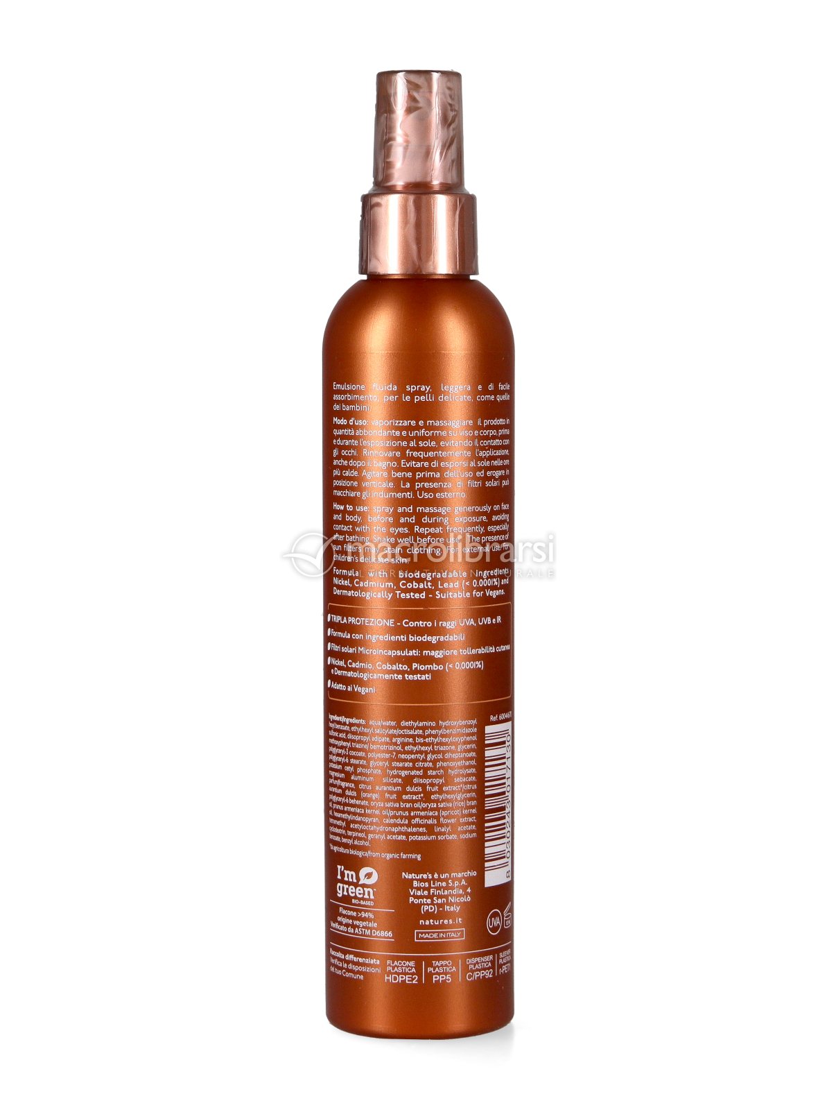 Spray Fluido Solare per Bambini con SPF 50+, una protezione molto alta per viso-corpo leggera, fresca, lattiginosa e a rapido assorbimento.