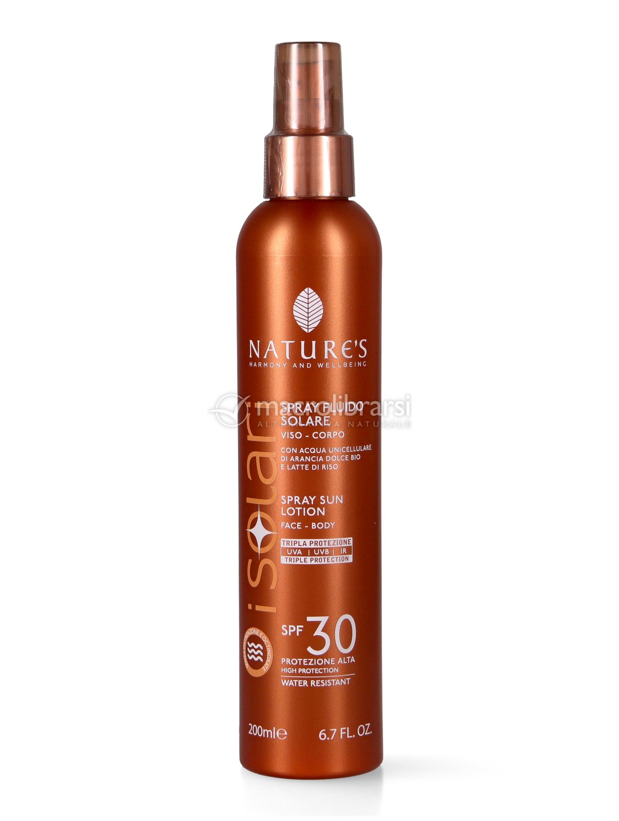 Spray Fluido Solare Viso-Corpo SPF 30, un’emulsione fresca e lattiginosa a rapido assorbimento ideale per pelli chiare e delicate.