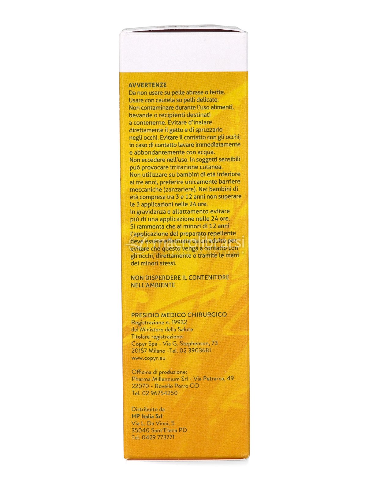 Avvertenze | Da non usare su pelle abrase o ferite. Usare con cautela su pelli delicate. Evitare d'inalare direttamente il getto e di spruzzare negli occhi. Evitare il contatto con gli occhi, in caso di contatto lavare immediatamente e abbondantemente con acqua. Non eccedere nell'uso. In soggetti sensibili può provocare imitazione cutanea. Non utilizzare su bambini di età inferiore a tre anni, preferire unicamente barriere meccaniche (zanzariere). Nei bambini di età compresa tra 3 e 12 anni non superare le 3 applicazioni nelle 24 ore. In gravidanza e allattamento evitare più di una applicazione nelle 24 ore. Si rammenta che ai minori di 12 anni l'applicazione del preparato repellente deve essere effettuata da un adulto per evitare che questo venda a contatto con gli occhi direttamente o tramite le mani dei minori stessi. NON DISPERDERE IL CONTENITORE NELL'AMBIENTE. - Liquido e vapori infiammabili. Provoca grave irritazione oculare. In caso di consultazione di un medico, tenere a disposizione il contenitore o l'etichetta del prodotto. Tenere fuori dalla portata dei bambini. Tenere lontano da fonti di calore superfici calde, scintille, fiamme libere o altre fonti di accensione. Non fumare. Tenere il recipiente ben chiuso. - IN CASO DI CONTATTO CON GLI OCCHI: sciacquare accuratamente per parecchi minuti. Togliere le eventuali lenti a contatto se è agevole farlo. Continuare a sciacquare. Se l'irritazione degli occhi persiste, consultare un medico. In caso di incendio, estinguere con acqua. Smaltire il recipiente in conformità alla regolamentazione nazionale. |
