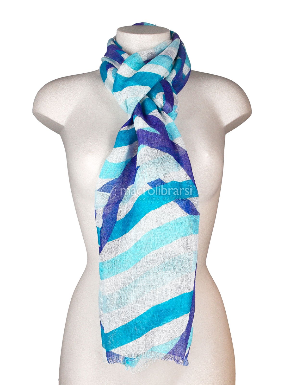 Il Foulard in lino stampato con disegno onde nei toni bianco e blu è una stola leggerissima e fresca, perfetta per la primavera/estate: si indossa con facilità su spalle e collo e aggiunge un tocco marino e luminoso anche ai look più semplici.