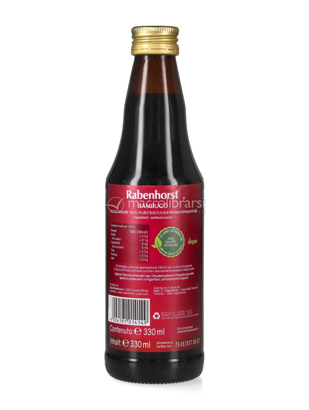 Puro succo di sambuco da prima spremitura, senza acqua aggiunta e senza zuccheri aggiunti. Ricco di sali minerali e vitamine A, B e C, dal gusto aromatico e intenso.