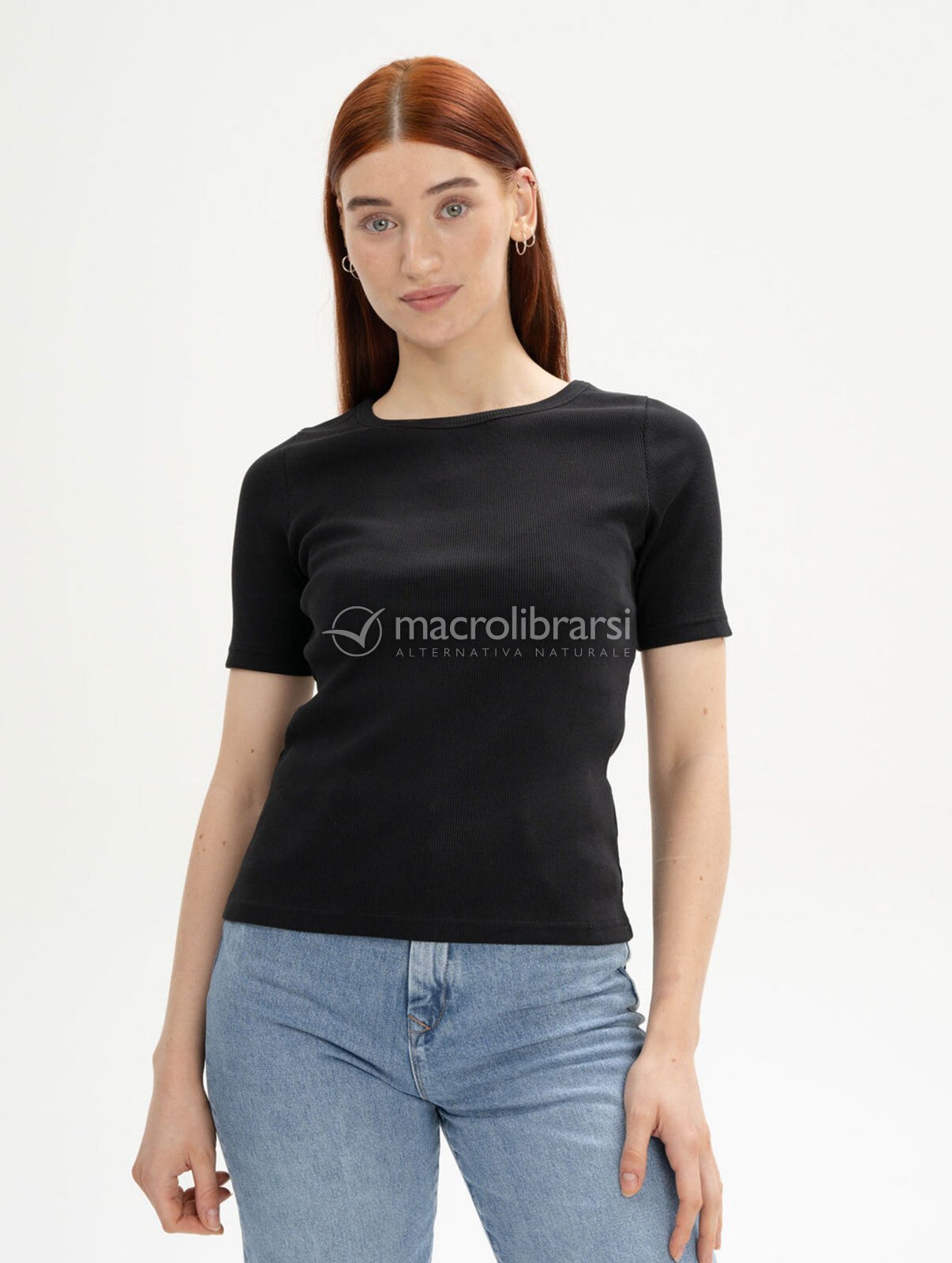 Scopri la T-shirt Jasleen nera in cotone biologico: un capo essenziale, sostenibile e incredibilmente versatile, pensato per adattarsi al tuo corpo e accompagnarti ogni giorno con comfort e stile. La sua linea aderente valorizza la silhouette, mentre la lavorazione a coste 2x2 garantisce elasticità naturale senza l’uso di elastan.
