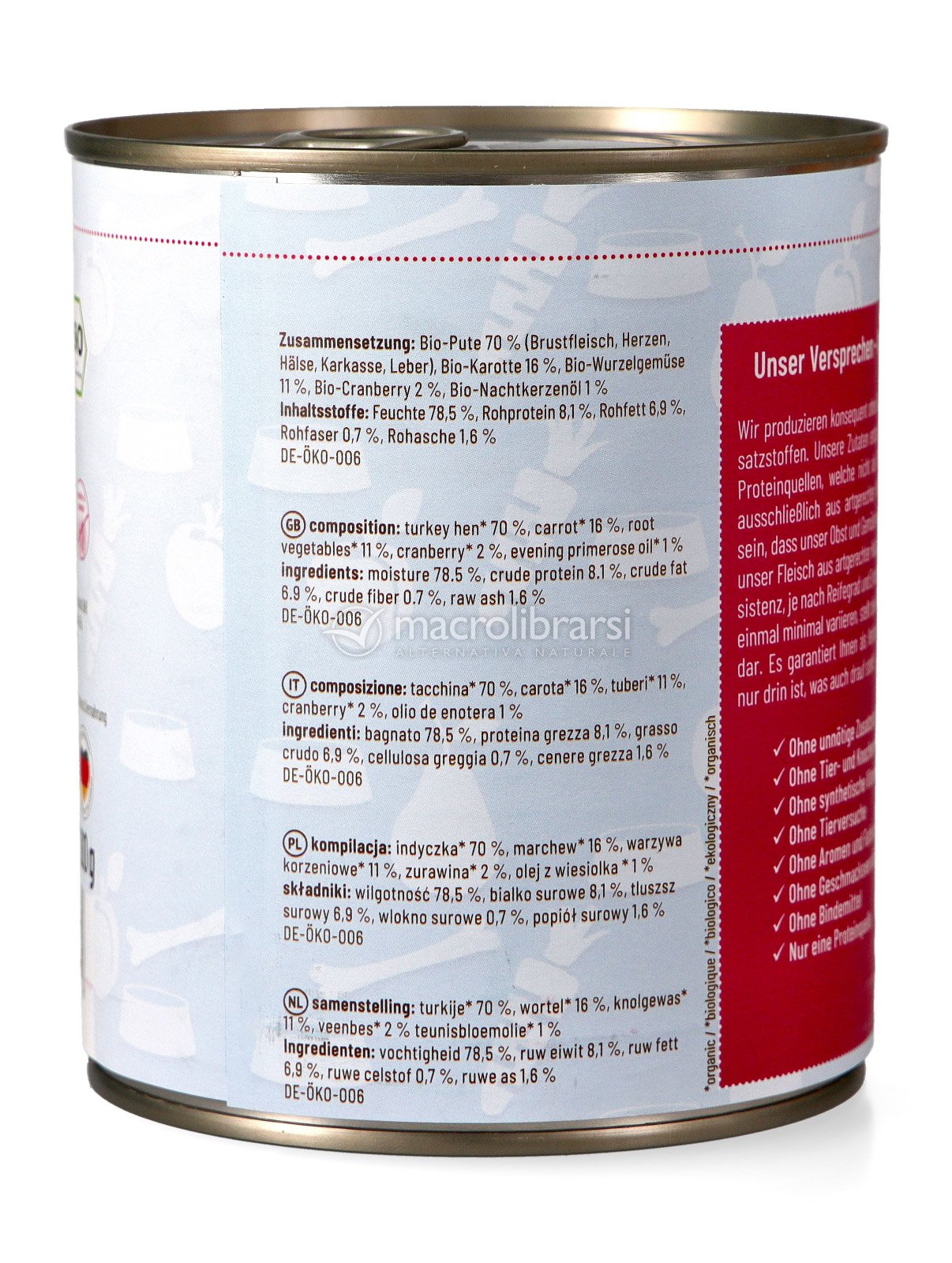 Lo trovo un ottimo menù. Questo cibo non ha un apporto proteico particolarmente alto, ma posso somministrare tacchino al cane senza preoccuparmi della qualità della materia prima che in questo caso è biologica. Non mi fido del cibo proveniente dagli allevamenti intensivo di pollame, vengono utilizzati troppi antibiotici e mangimi di dubbia qualità.