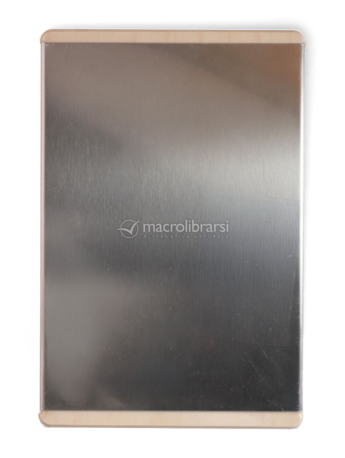 Tagliere rettangolare in acciaio inox 18/10 con base in multistrato di betulla: igienico, resistente e perfetto per l’uso quotidiano.