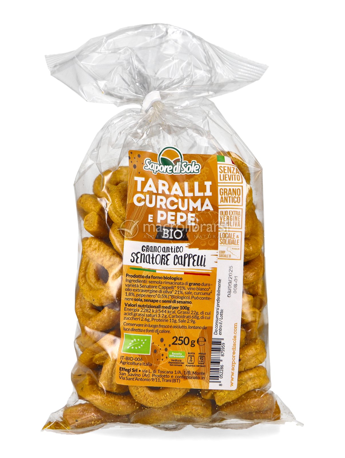 Croccanti e friabili, i Taralli Senatore Cappelli Curcuma e Pepe di Sapore di Sole, sono preparati secondo la tradizionale ricetta senza lievito, arricchita dalla nota calda e aromatica della curcuma e quella pungente del pepe, in un abbinamento che è oramai un grande classico.