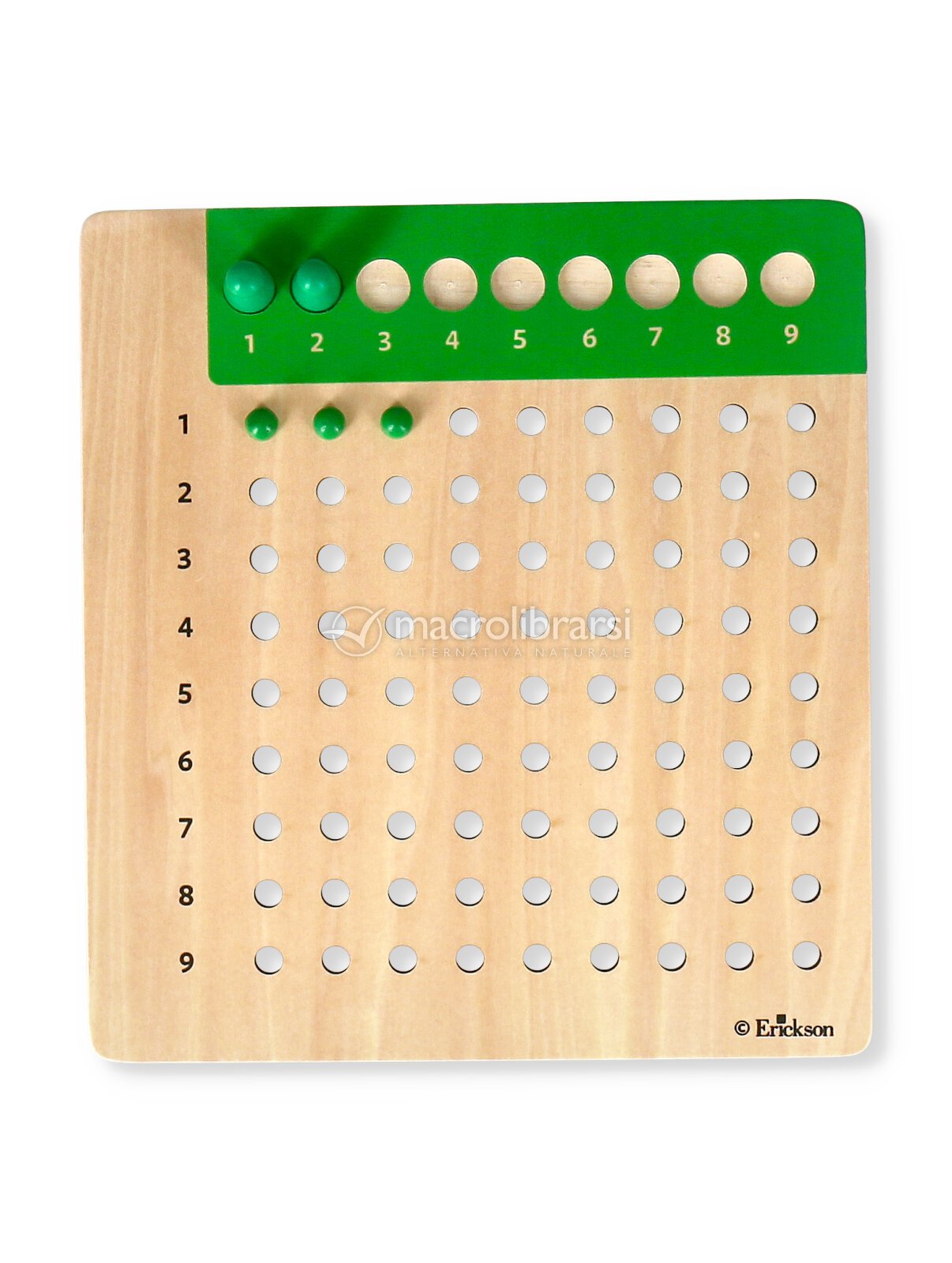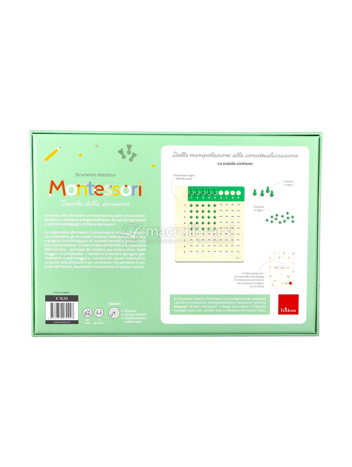 Il cofanetto contiene un fascicoletto guida con i principi della metodologia montessoriana e le attività che si possono svolgere con la tavola; una tavola rigida, completa di 81 perle verdi più 10 di riserva (dividendo) e 9 birilli verdi (divisore); l'accesso a risorse on-line (moduli con le operazioni da scaricare e stampare).