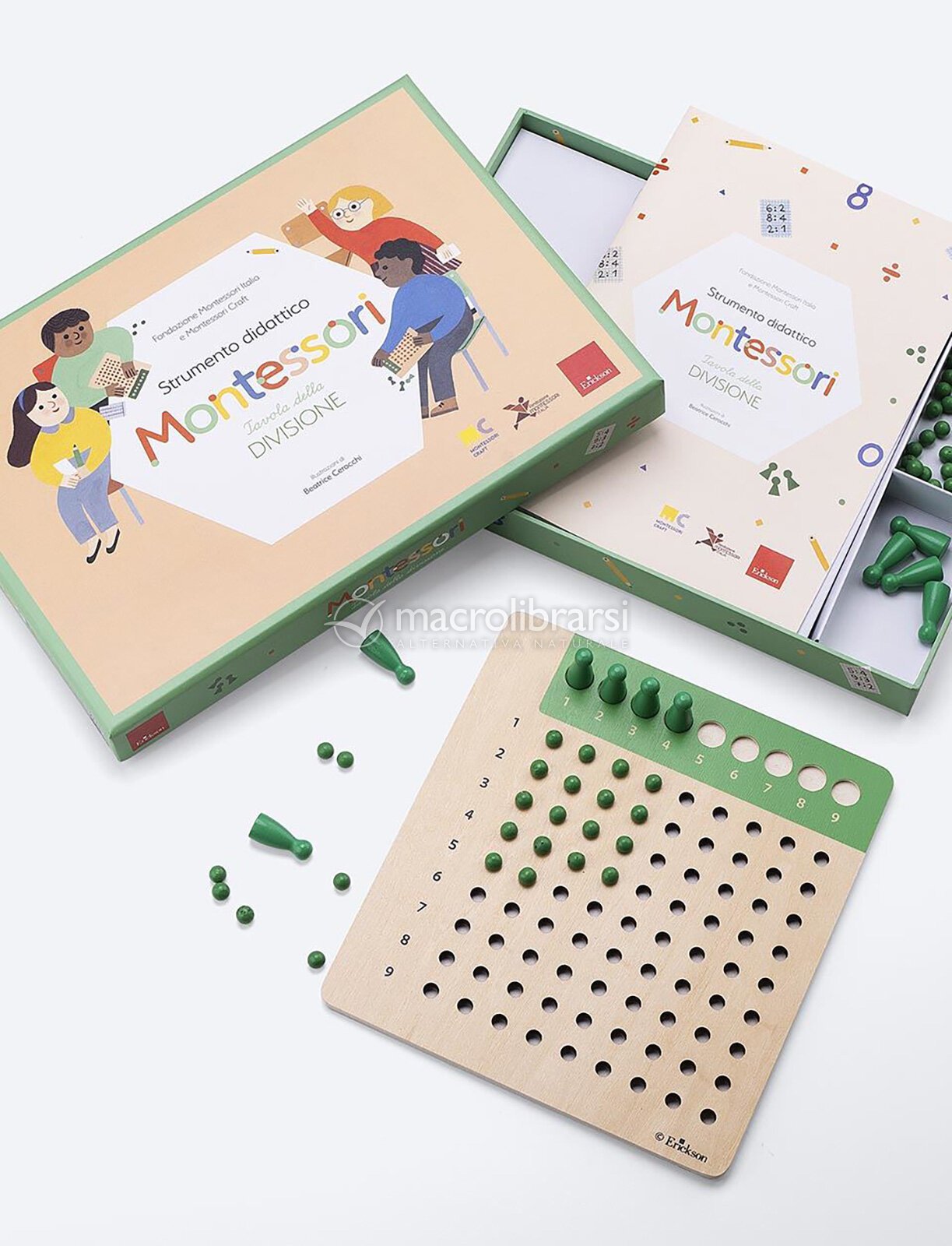 Materiale educativo ispirato al pensiero pedagogico di Maria Montessori, favorisce nei bambini e nelle bambine la memorizzazione delle combinazioni della divisione ad una cifra, accompagnandoli in modo molto chiaro alla comprensione del resto. Inoltre, il materiale prepara il calcolo a mente.