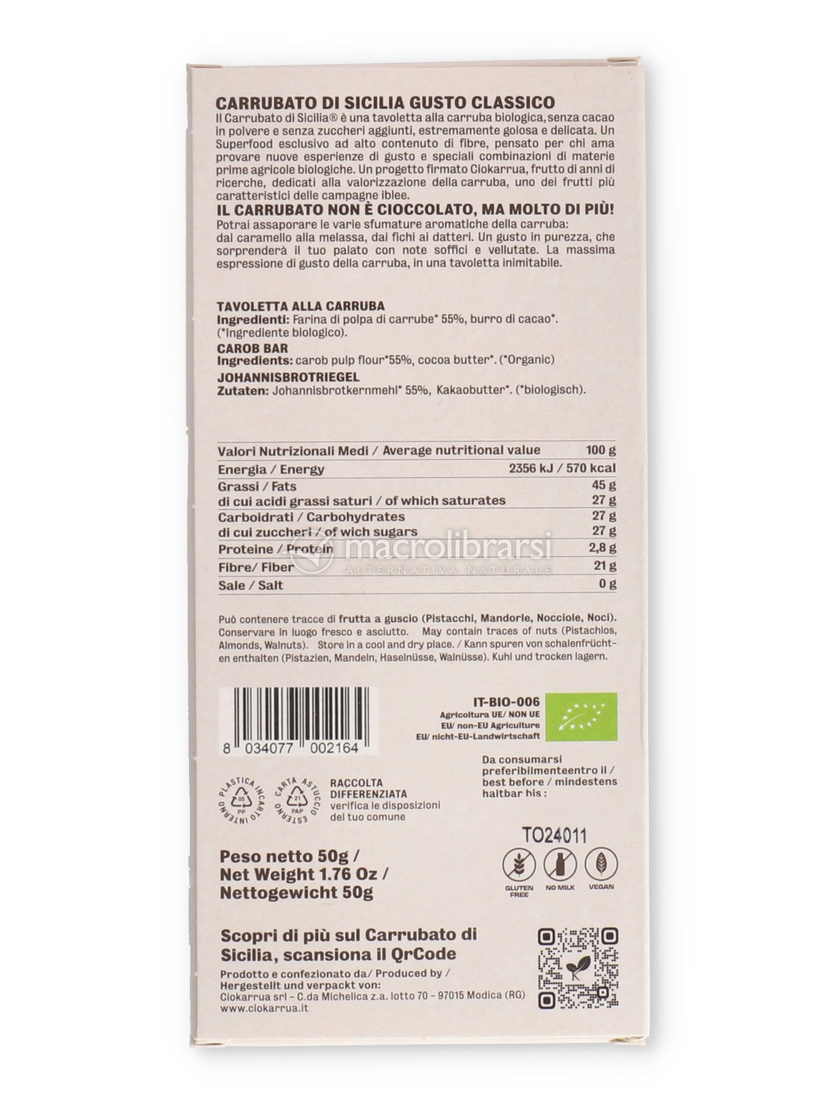 Questa tavoletta artigianale e biologica alla carruba è davvero speciale, molto buona e dolce, nonostante non abbia zuccheri aggiunti... Mi ha attirato perché è senza lattosio e perché mi ha incuriosito la carruba, un frutto che non conoscevo... Ho scoperto che ha un alto contenuto di fibre, e questo è ottimo! Certo, il suo sapore è molto particolare, anche se simile al cioccolato, e può non piacere a tutti...