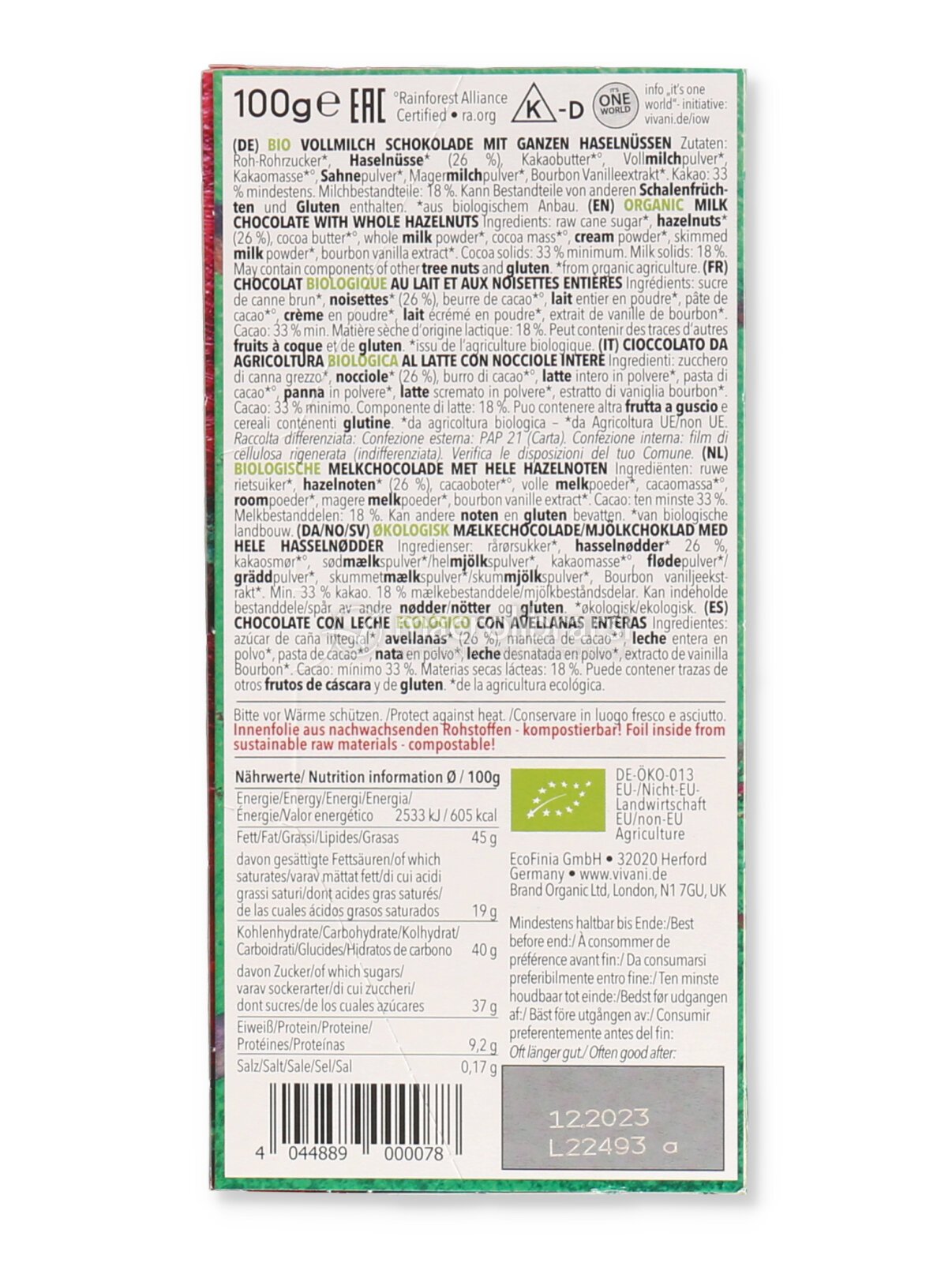 Ottimo cioccolato al latte con nocciole intere! Il gusto del cioccolato Vivani è perfettamente bilanciato, le materie prime sono di ottima qualità ed è un prodotto immancabile nella mia dispensa. Il fatto che sia biologico e che abbia un'etica sostenibile è un importante valore aggiunto. Consigliato.