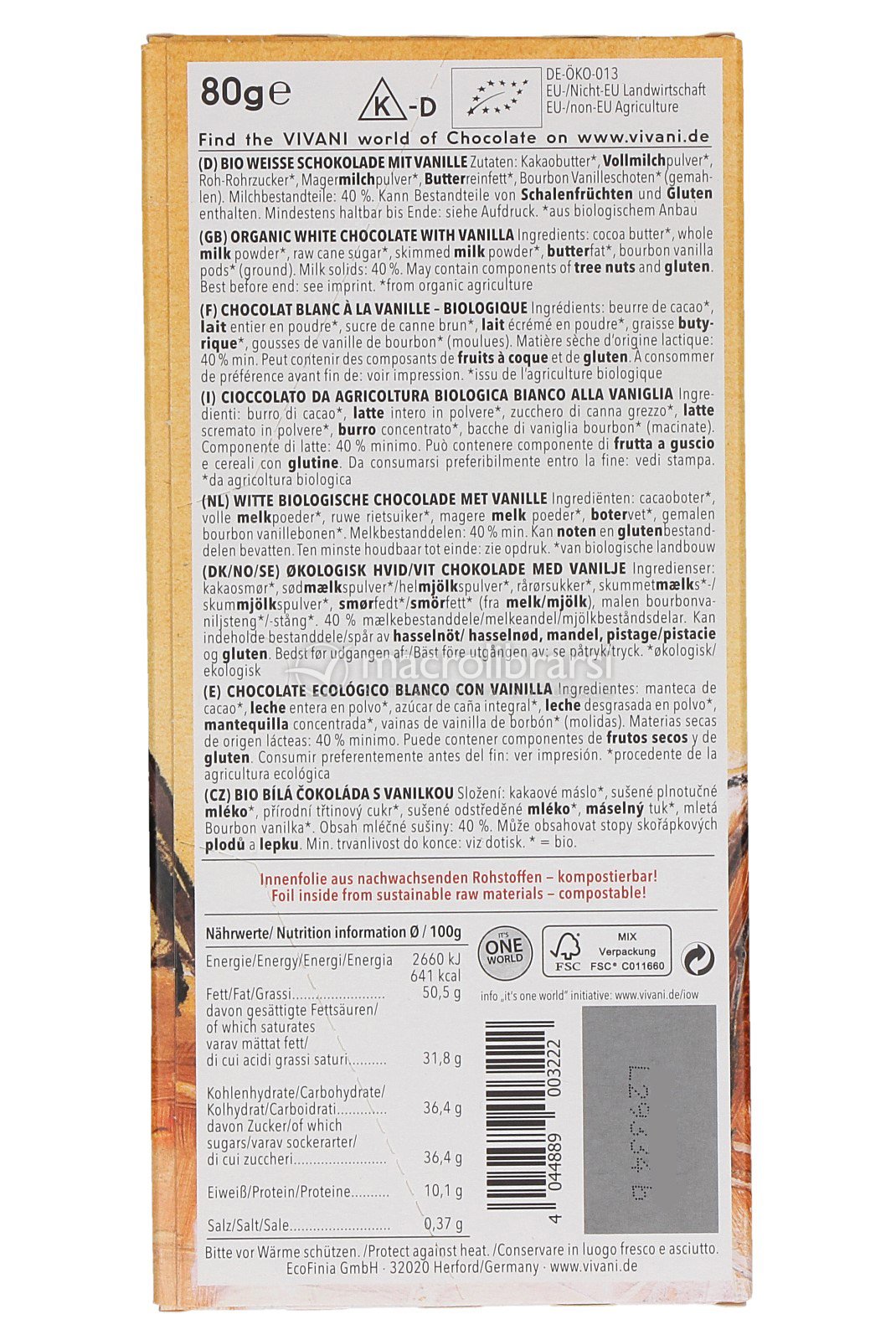 L'ho amato al primo assaggio. Negli anni ho avuto difficoltà a trovare un buon cioccolato bianco che avesse davvero il gusto della vaniglia fino a quando non l'ho trovato su Macrolibrarsi. Questo cioccolato è poesia pura. Il suo gusto coniuga l'intensa nota della vaniglia (la presenza dei baccelli di vaniglia bourbon macinati si sente) alla dolcezza del cioccolato bianco di alta qualità. Consigliato.