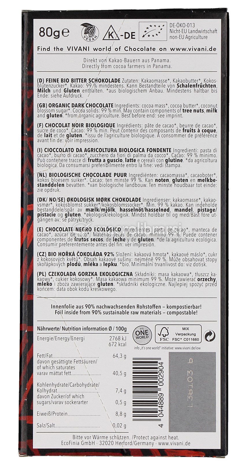 Personalmente apprezzo tantissimo la qualità del cioccolato Vivani, questo in particolare è un 99% mitigato da una piccolissima aggiunta di zucchero da fiori di palma da cocco che ne ammorbidisce egregiamente il sapore. Ha tutta la ricchezza di aromi e la lunga persistenza del cacao Panama, lo trovo davvero molto piacevole e lo consiglio!