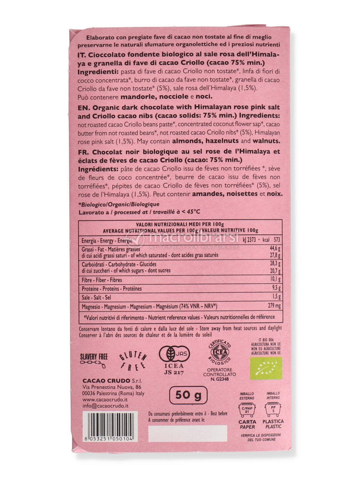 La linfa dei fiori di cocco ne esalta la delicatezza, mentre il sale rosa dell’Himalaya ne potenzia l’intensità e la granella di cacao afferma il sapore conferendo una delicata croccantezza.