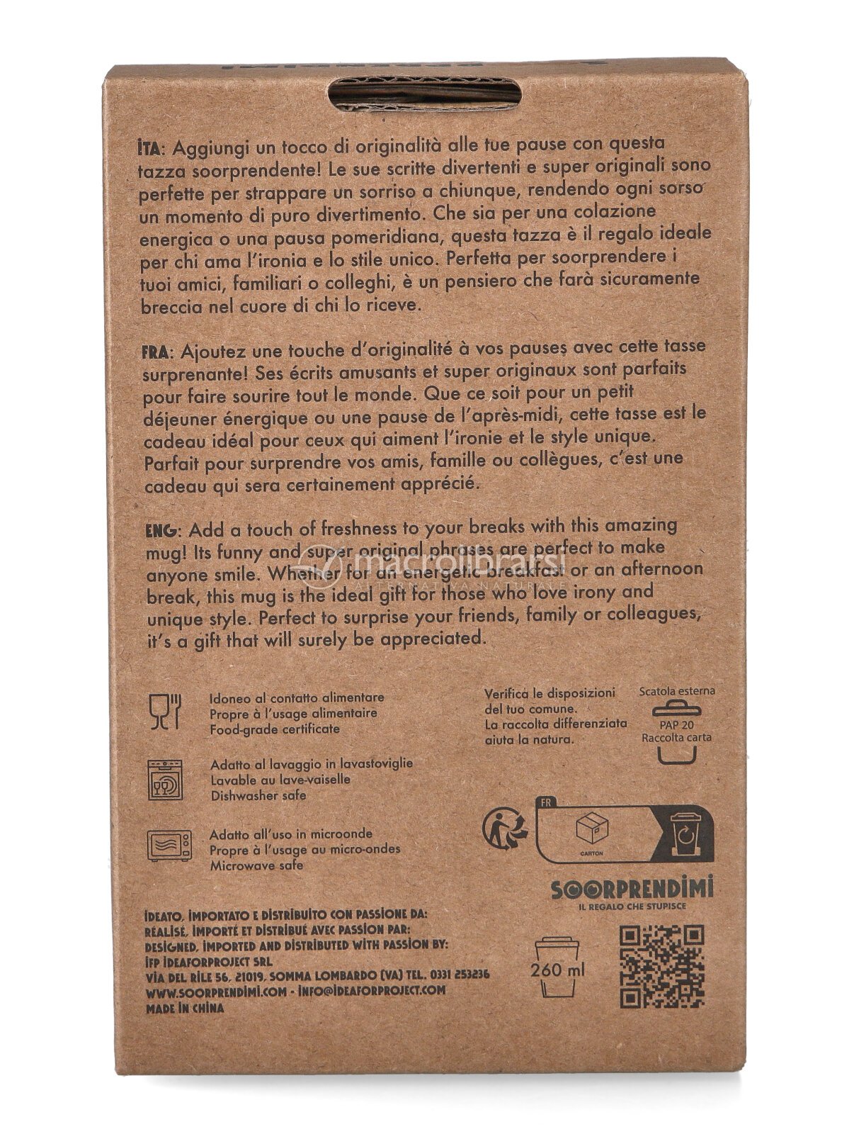 Ho preso questa tazza come regalo per un'amica ed è stata molto apprezzata, sia per la simpatia della scritta sia per il materiale, ceramica resistente, senza presenza di plastica.