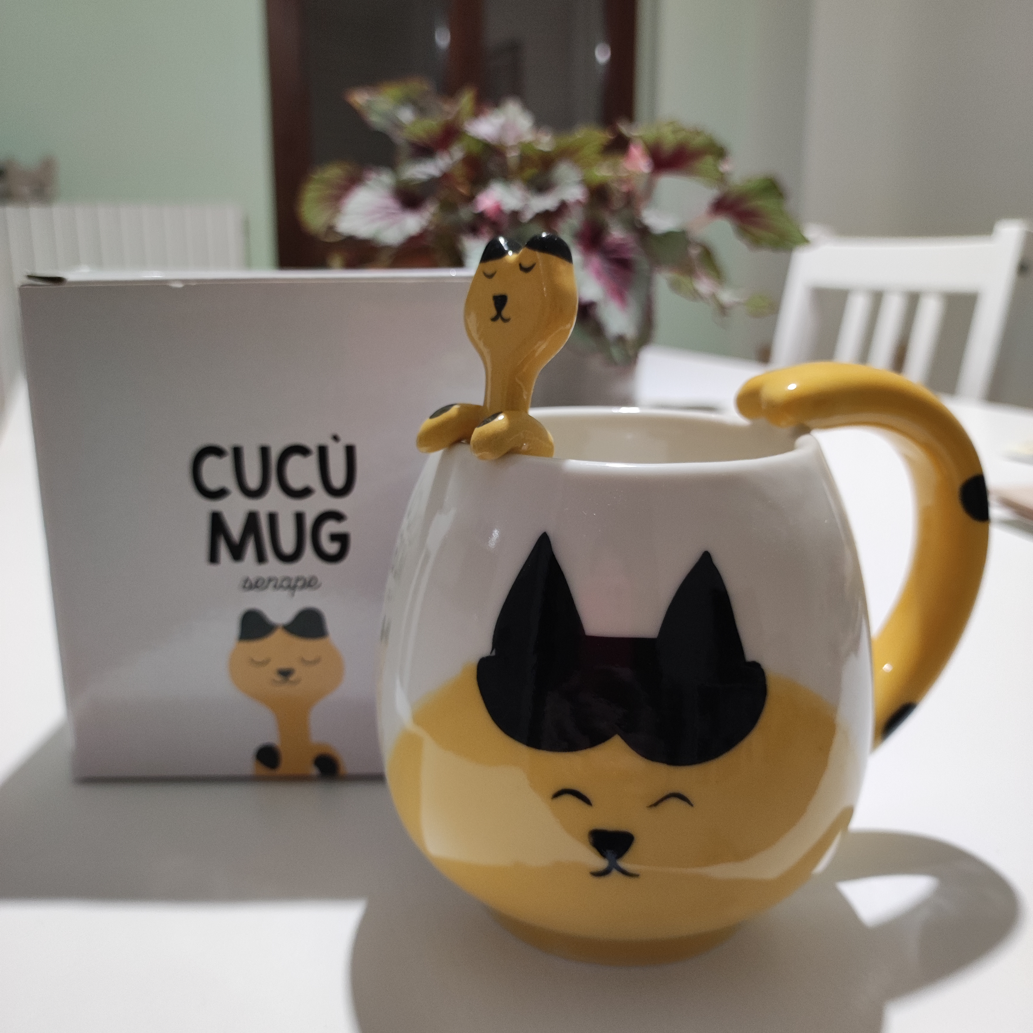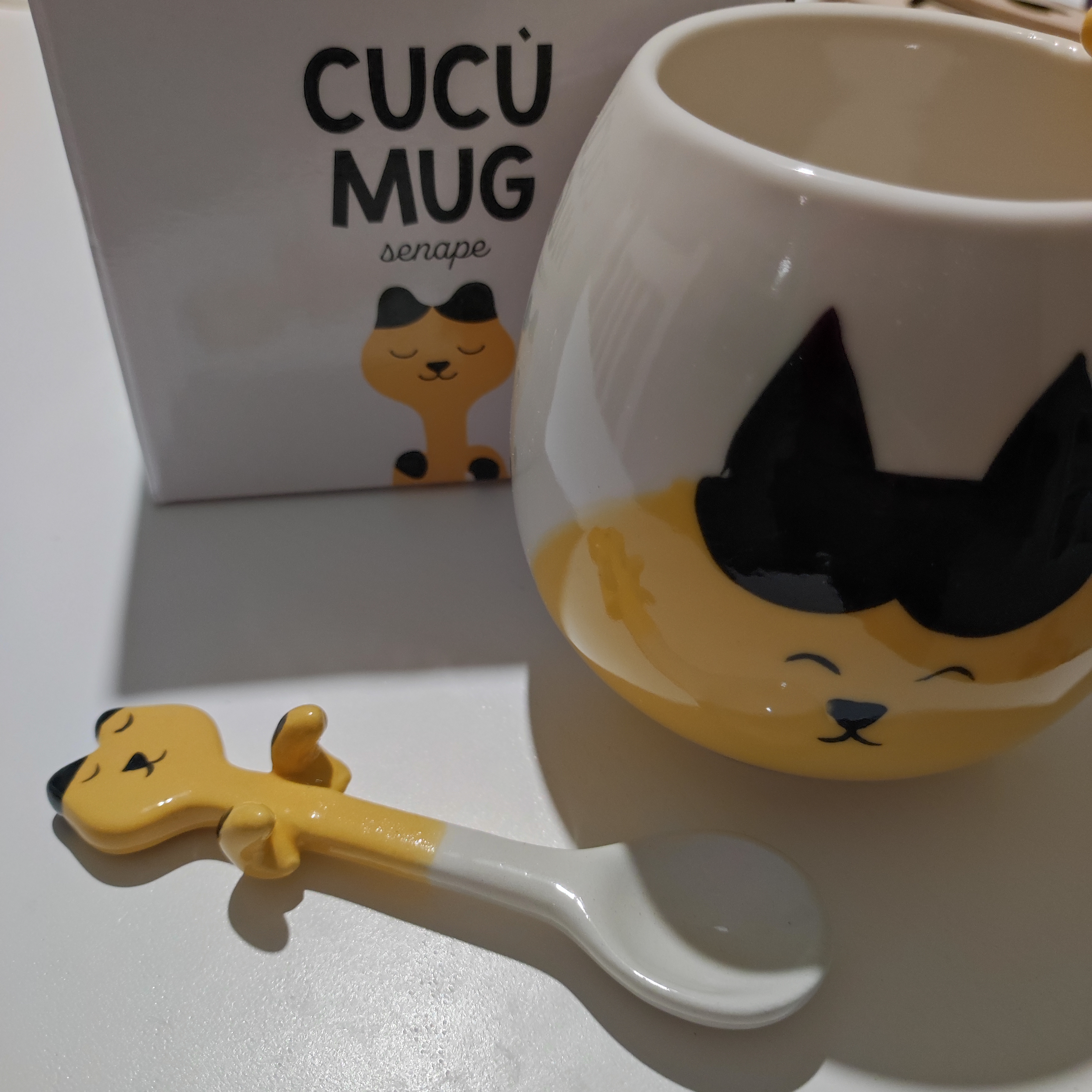 Ho acquistato questa tazza da regalare a Natale ma... Sono tentata di tenerla! È proprio simpatica l'idea del cucchiaino che, una volta agganciato al bordo, sembra una gattino che si tira su dall'interno. Mi sembra di ceramica buona, spessa, ed è dipinto a mano, con una bella smaltatura. Mi piace molto il punto di colore senape.