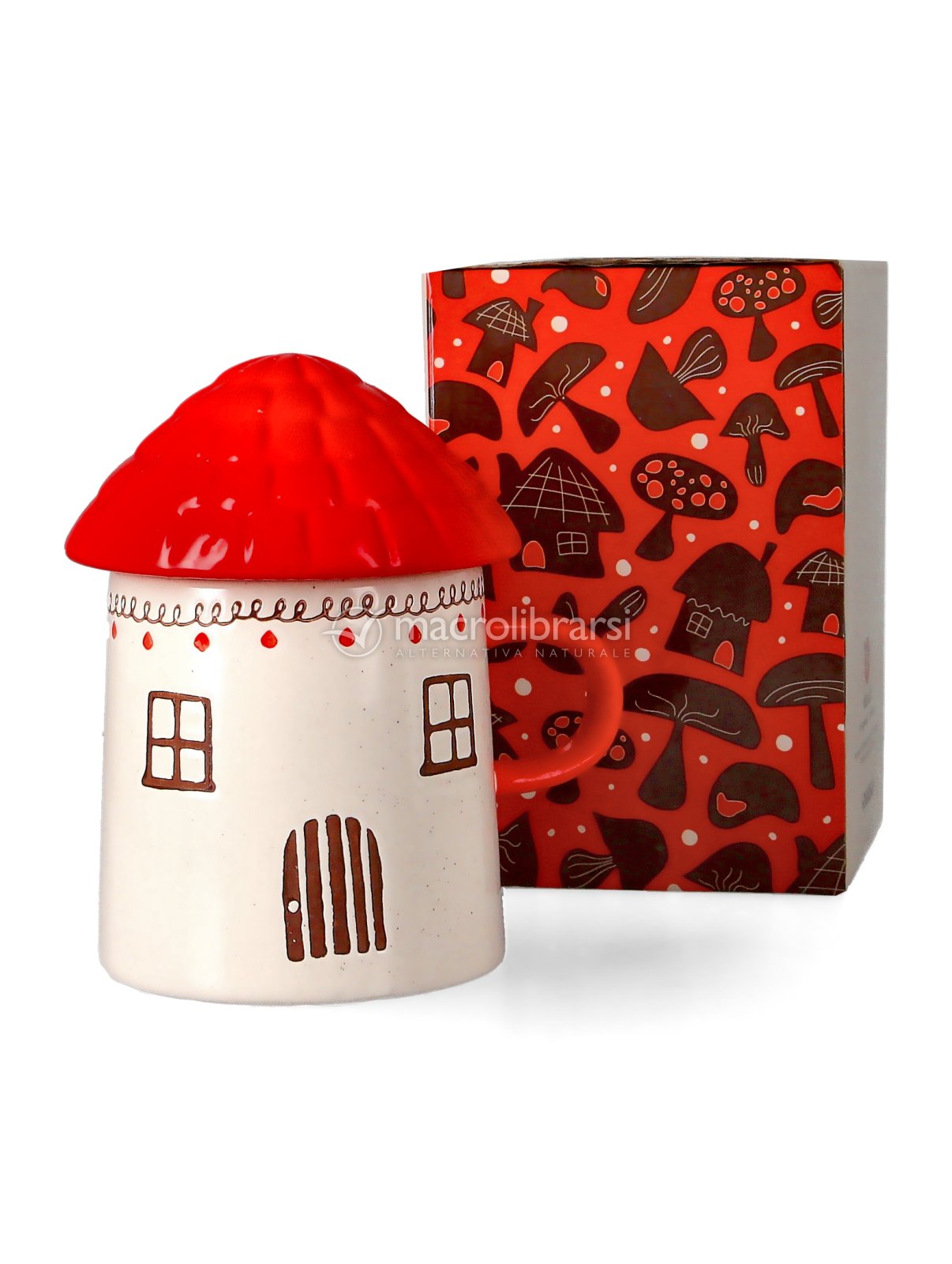 Il pioppino è un fungo piccolo con un cappello tondeggiante e scuro, un fungo molto gustoso e dall'aspetto delicato. La tazza a forma di casetta ne ripropone le forme in modo ironico e artistico.