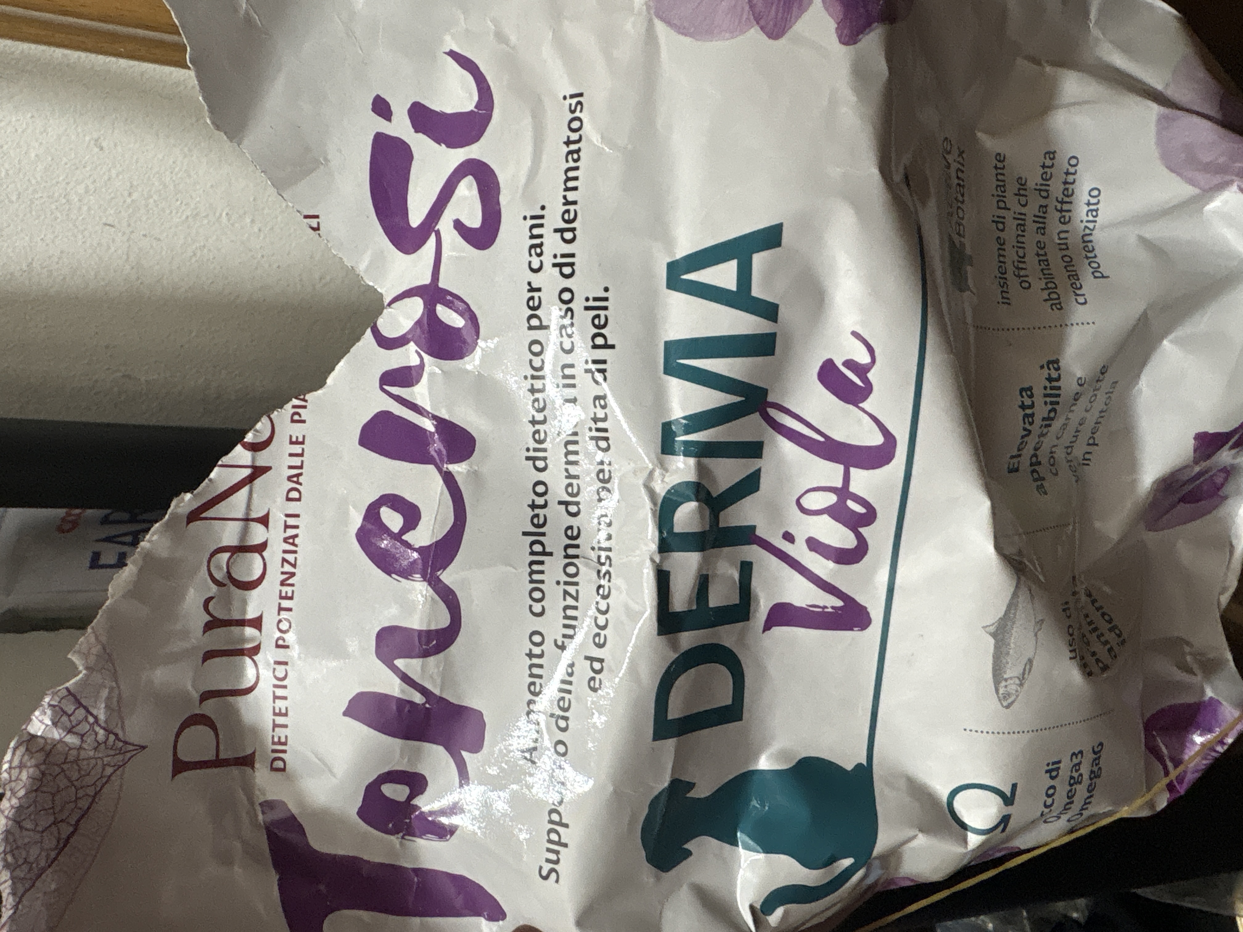 Avvertenze: si raccomanda il parere di un veterinario prima dell’uso.  Livello elevato di acido linoleico (AL) e somma di acido eicosapentaenoico (EPA) e di acido docosaesaenoico (DHA). Non somministrare in concomitanza con Derma Viola Integra: i due prodotti sono alternativi, non complementari.