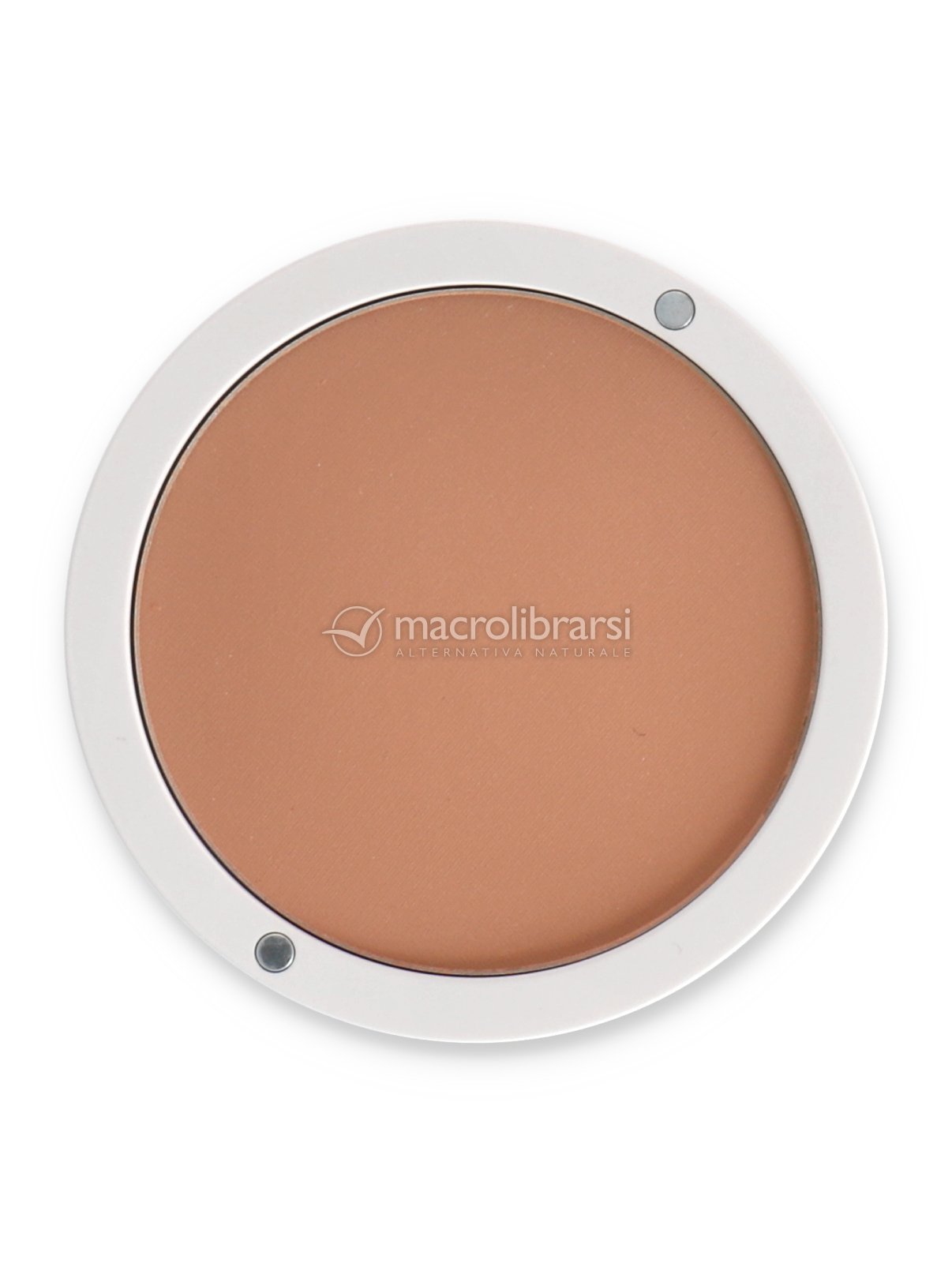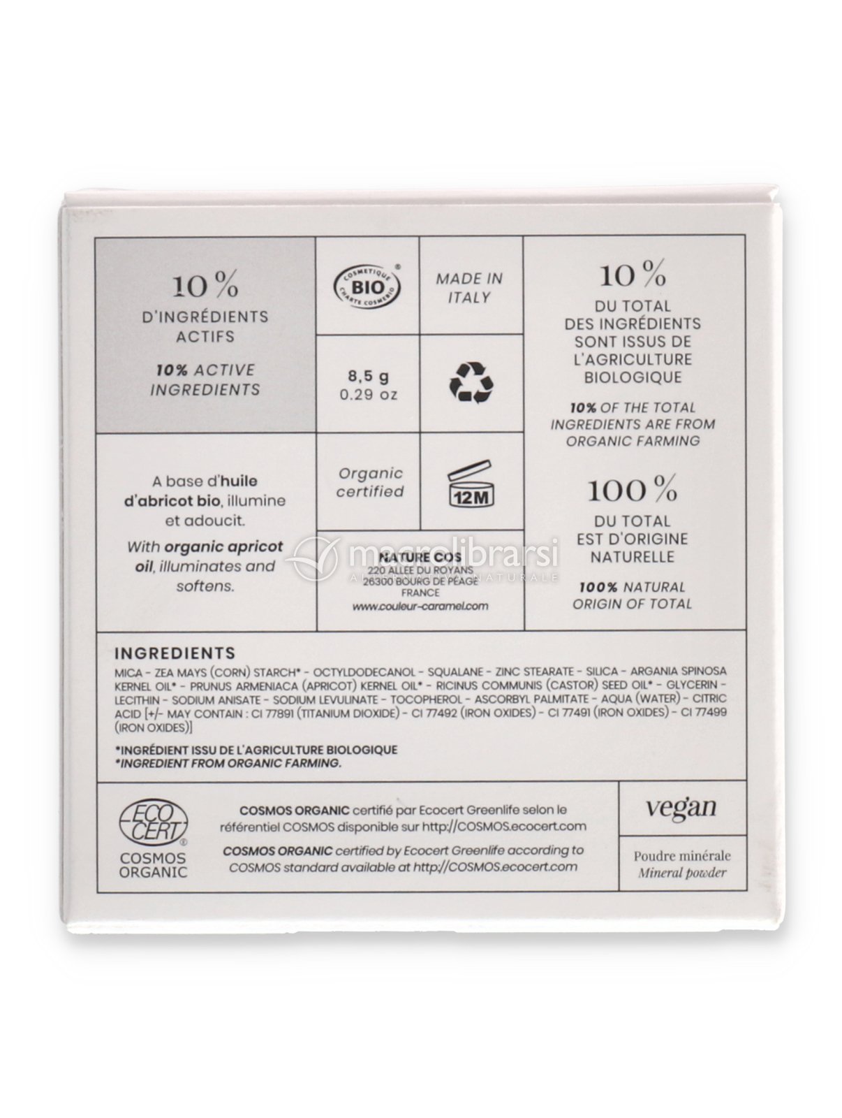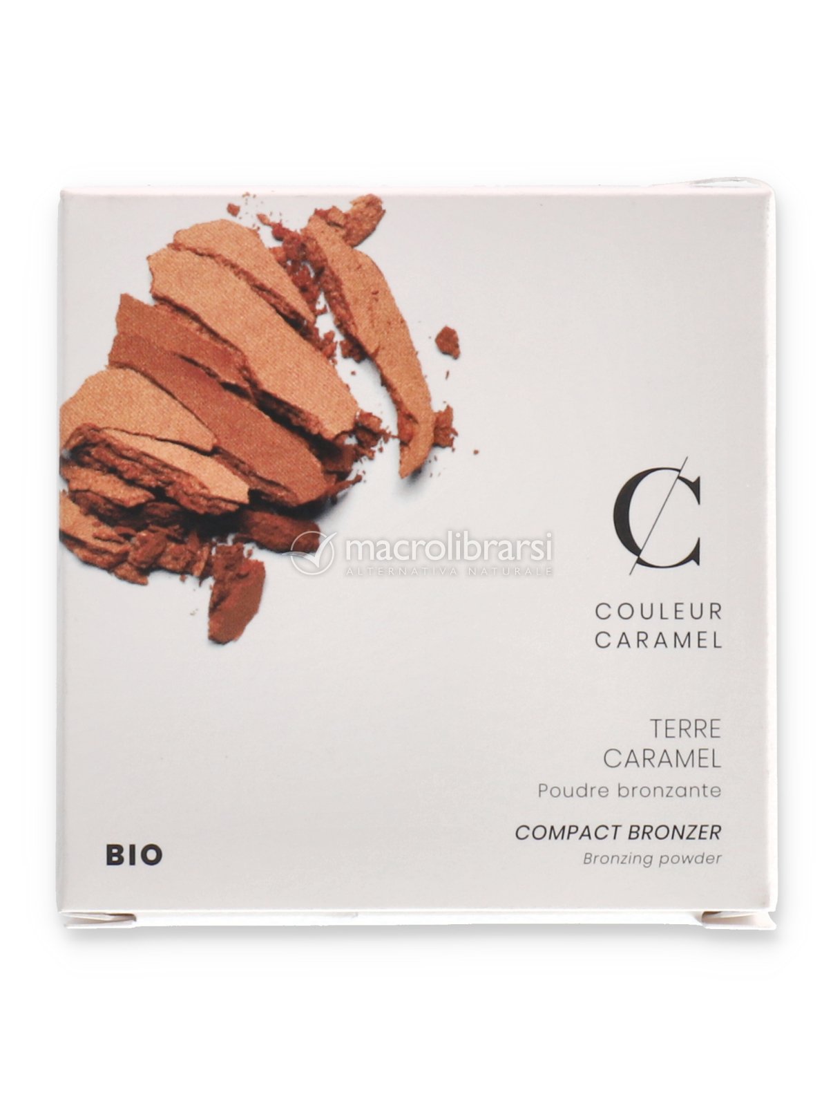 Bronzer Terre Caramel n.22 Brun Orangé Nacré, una terra compatta biologica dalla texture fine e leggera, ideale per intensificare il colorito dorato dell’abbronzatura.