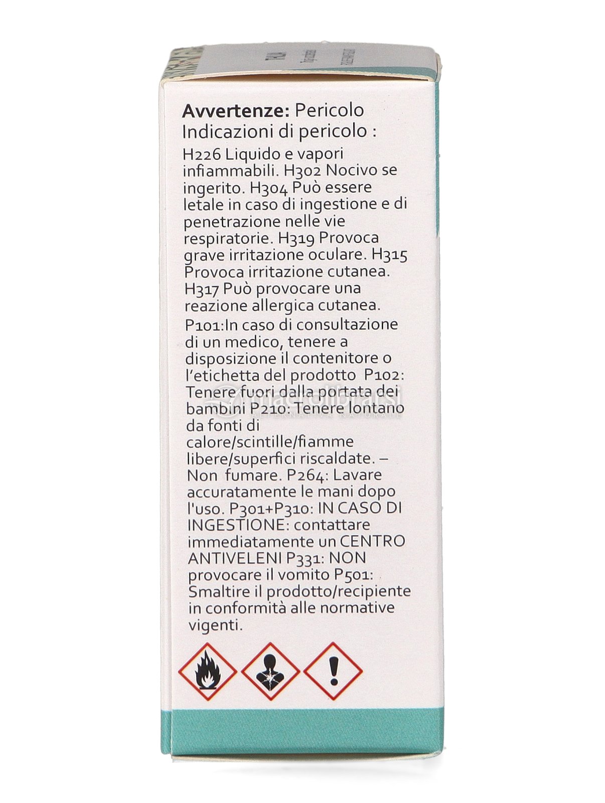 | Avvertenze | Indicazioni di pericolo: H226 Liquido e vapori infiammabili. H302 Nocivo se ingerito. H304 Può essere letale in caso di ingestione e di penetrazione nelle vie respiratorie. H319 Provoca grave irritazione oculare. H315 Provoca irritazione cutanea. H317 Può provocare una reazione allergica cutanea. P101:In caso di consultazione di un medico, tenere a disposizione il contenitore o l'etichetta del prodotto P102: Tenere fuori dalla portata dei bambini P210: Tenere lontano da fonti di calore/scintille/fiamme libere/superfici riscaldate. - Non fumare. P264: Lavare accuratamente le mani dopo l'uso. P301+P310: IN CASO DI INGESTIONE: contattare immediatamente un CENTRO ANTIVELENI P331: NON provocare il vomito P501: Smaltire il prodotto/recipiente in conformità alle normative vigenti. |