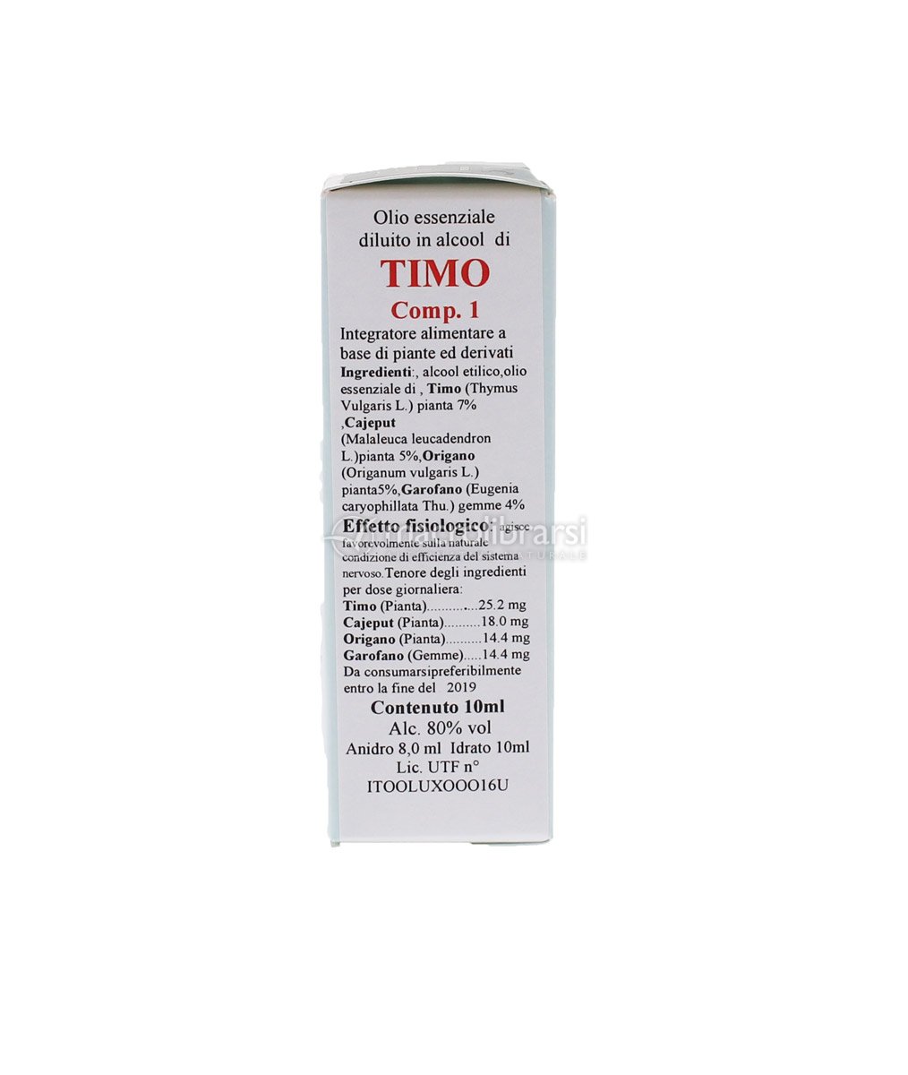 L'estratto idrolacolico di Timo Comp. contiene essenze di TIMO, CAJEPUT, ORIGANO, GAROFANO in alcool 80° vol.