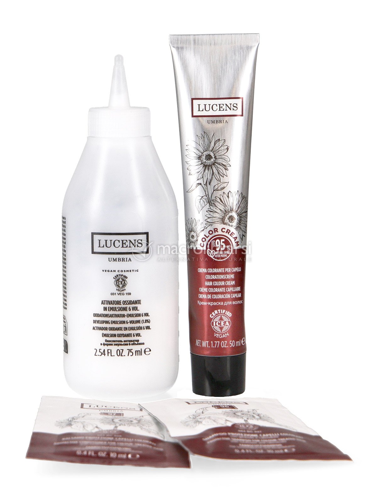 Questa tinta Lucens ' e' priva di ammoniaca e siliconi viene prodotta in Umbria da agricoltura biologica . Il risultato e' fantastico copre bene i capelli bianchi , non da' nessun fastidio alla cute e il tempo di posa e' di 40 minuti. In dotazione regalano un campione di shampoo ed uno di balsamo , ottimi entrambi.