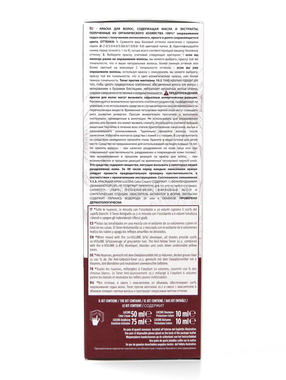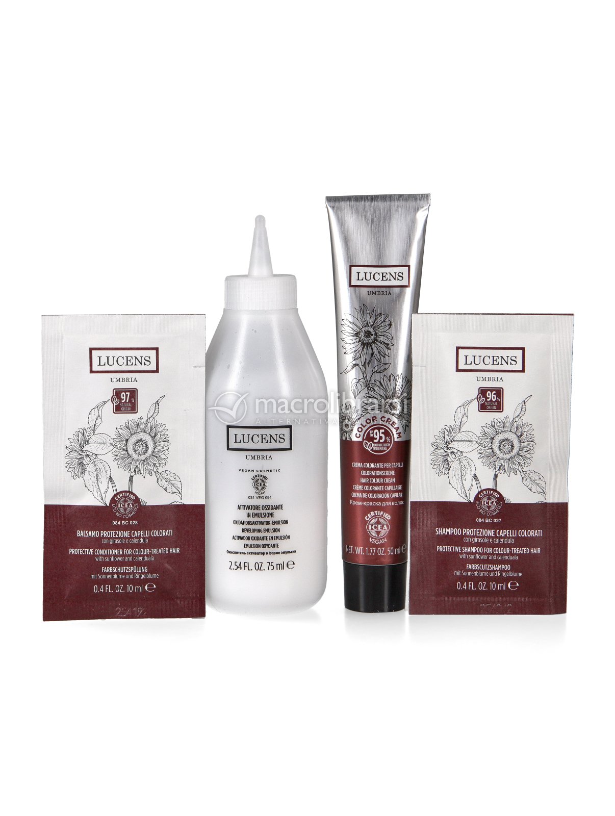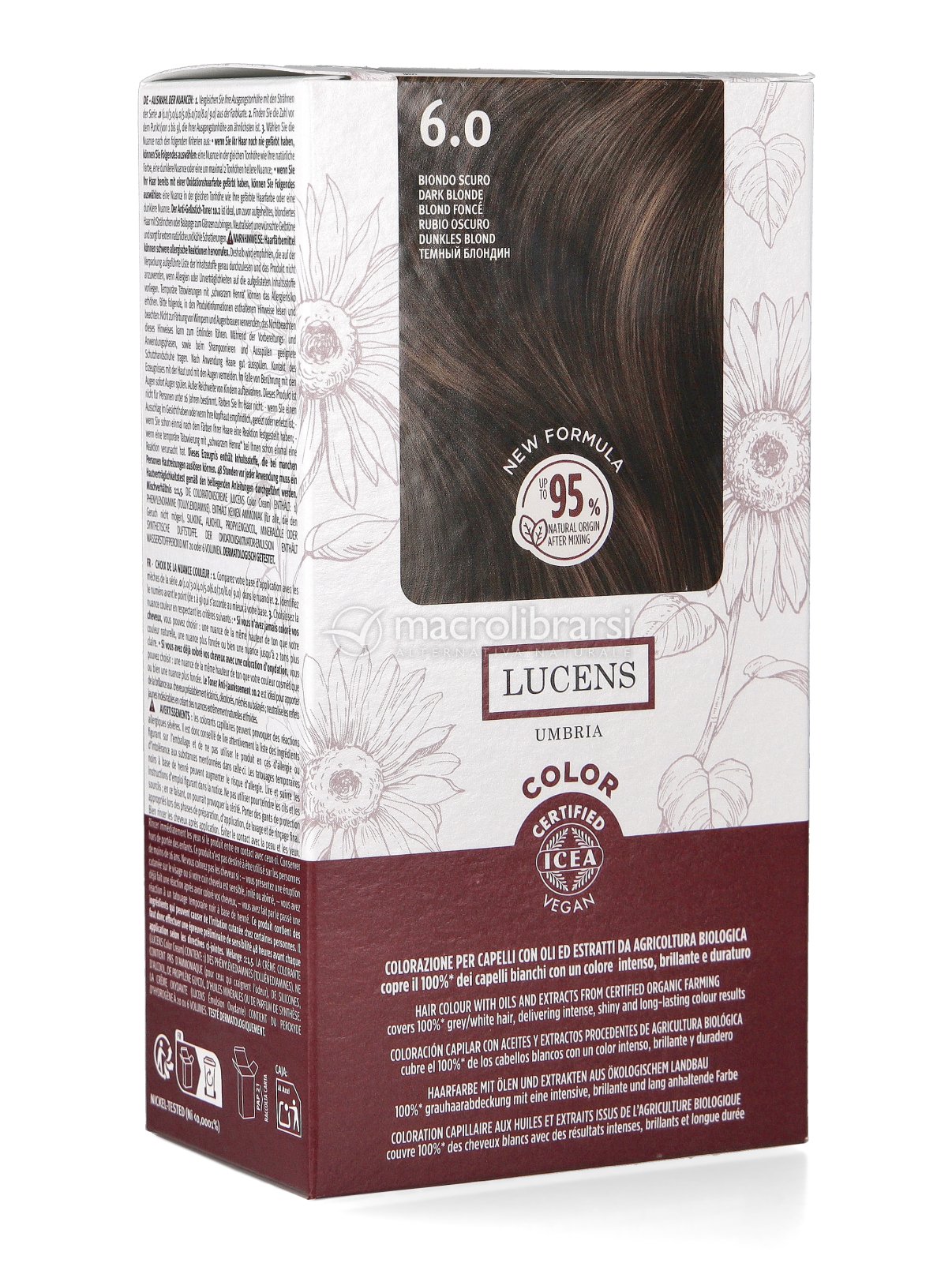 Questa tinta Lucens ' e' priva di ammoniaca e siliconi viene prodotta in Umbria da agricoltura biologica . Il risultato e' fantastico copre bene i capelli bianchi , non da' nessun fastidio alla cute e il tempo di posa e' di 40 minuti. In dotazione regalano un campione di shampoo ed uno di balsamo , ottimi entrambi.