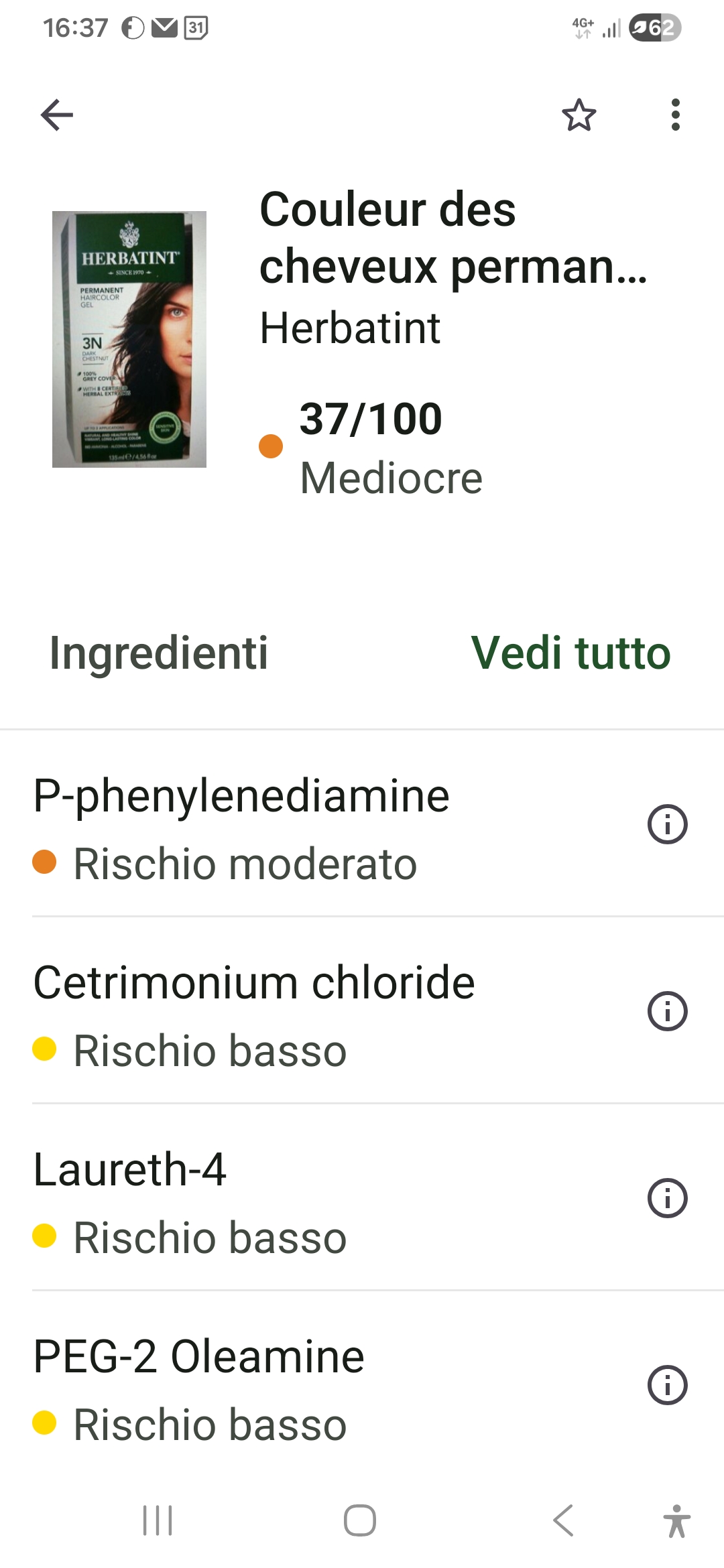 Darei 5 stelle se solo nell'inci non comparissero alcuni ingredienti a rischio moderato. Efficace la copertura dei bianchi e molto belli i riflessi che dona. Si potrà mai avere la perfezione, vale a dire un prodotto efficace e completamente innocuo? Chissà...incrocio le dita!