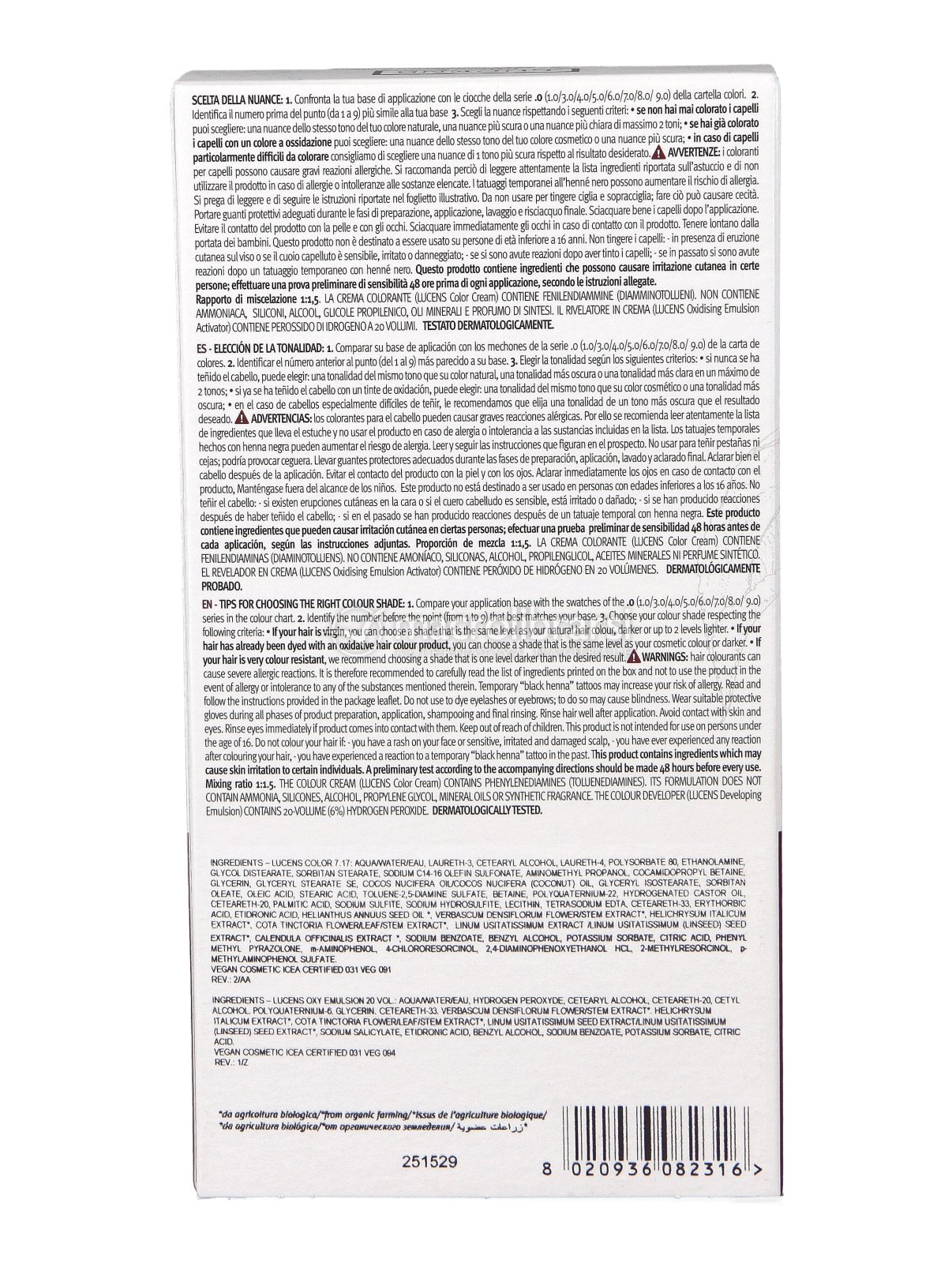 Note del produttoreColorazione permanente, con oli ed estratti da agricoltura biologica, per un colore intenso, brillante e duraturo fino al 75% di ingredienti di origine naturale, dopo la miscelazione (ora portato a 80%, grazie all’adeguamento alla norma ISO 16128 di alcune materie prime). Abbiamo adottato la dicitura "fino" perché la percentuale varia leggermente in base alla nuance e l’80% rappresenta una media dei valori (alcuni sono più alti; altri più bassi).