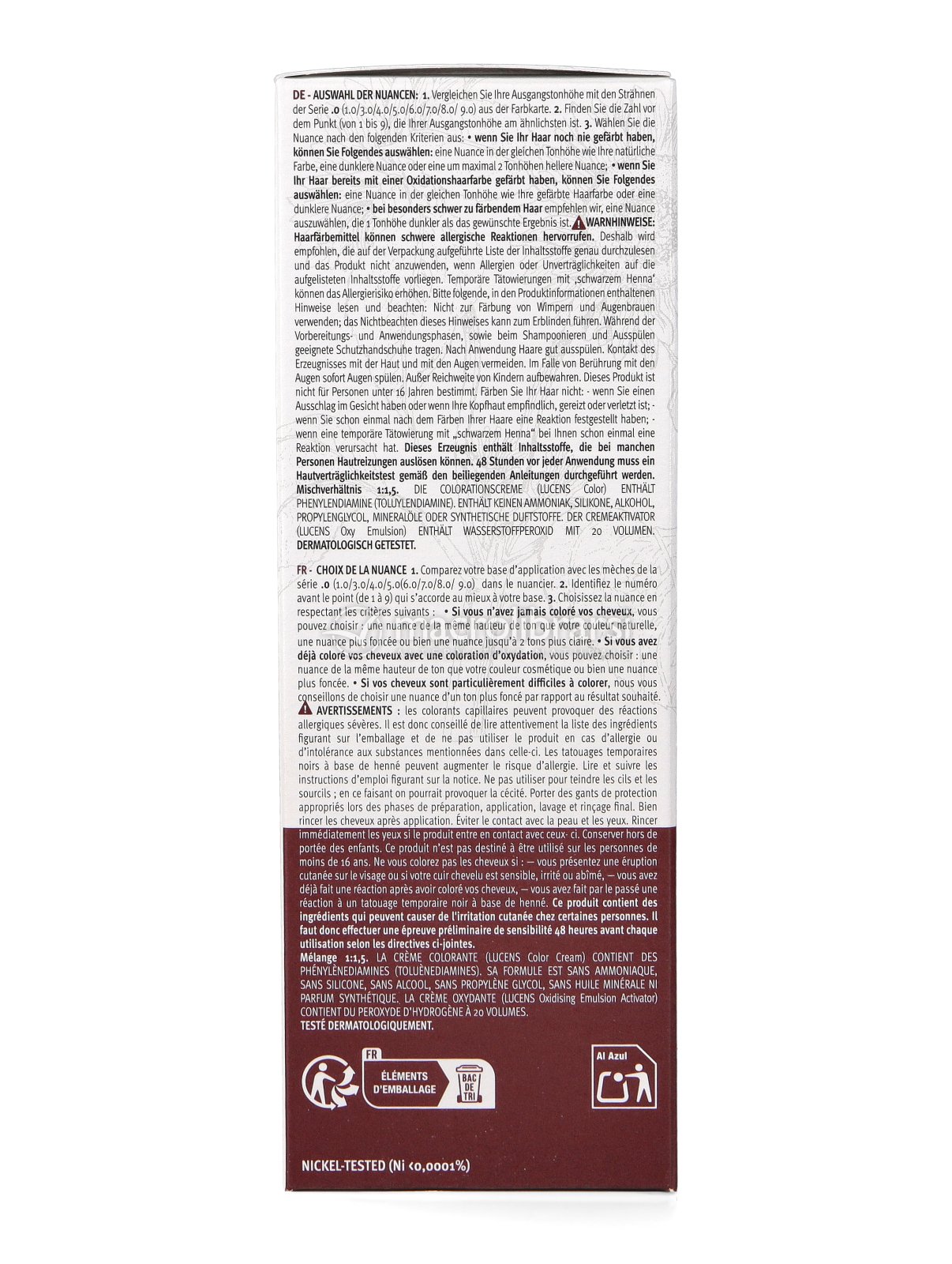 Le avvertenze d’uso e le istruzioni per la miscelazione, l’applicazione, la posa e il risciacquo del colore sono riportate nel foglietto illustrativo contenuto nel kit. Si raccomanda di leggerle attentamente prima di procedere alla colorazione e di seguirle scrupolosamente.