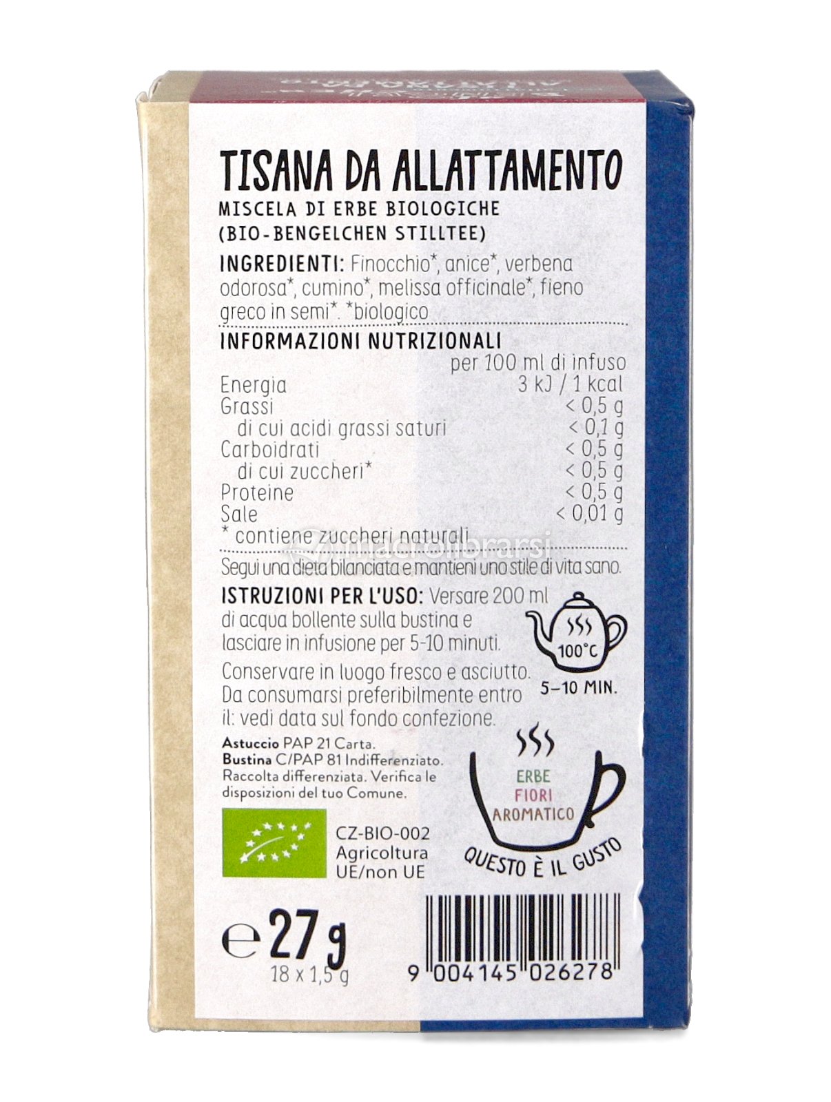 La Tisana per l'allattamento è una miscela di erbe biologiche a base di finocchio, anice, verbena, cumino, melissa e fieno greco.