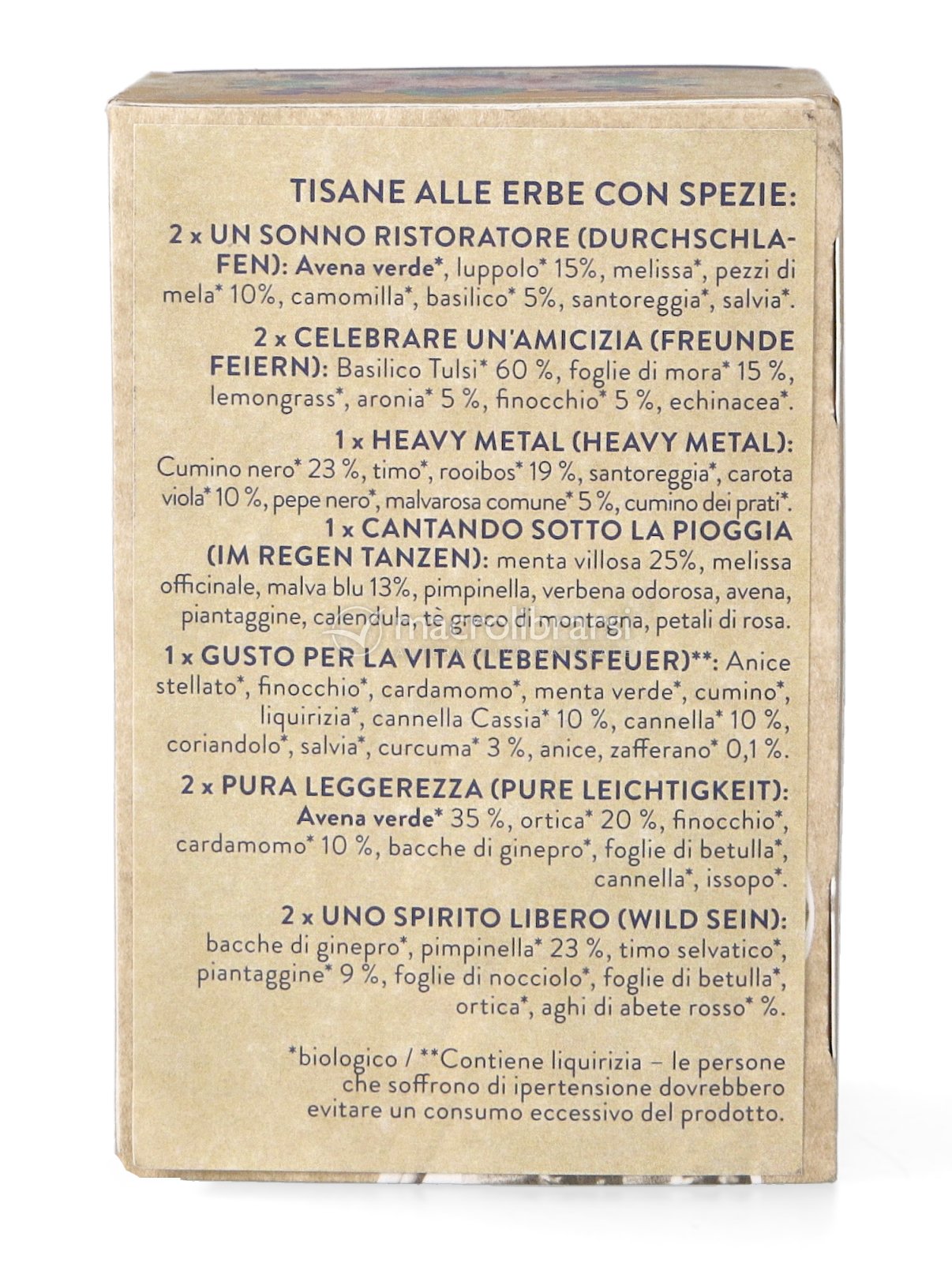 - 1 x gusto per la vita: anice stellato, finocchio, cardamomo, menta verde, cumino, liquirizia, cannella cassia, cannella, coriandolo, salvia, curcuma, anice, zafferano.