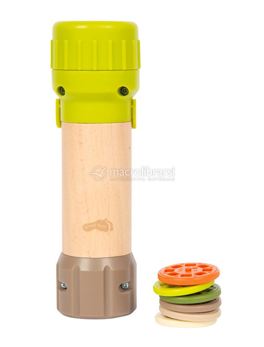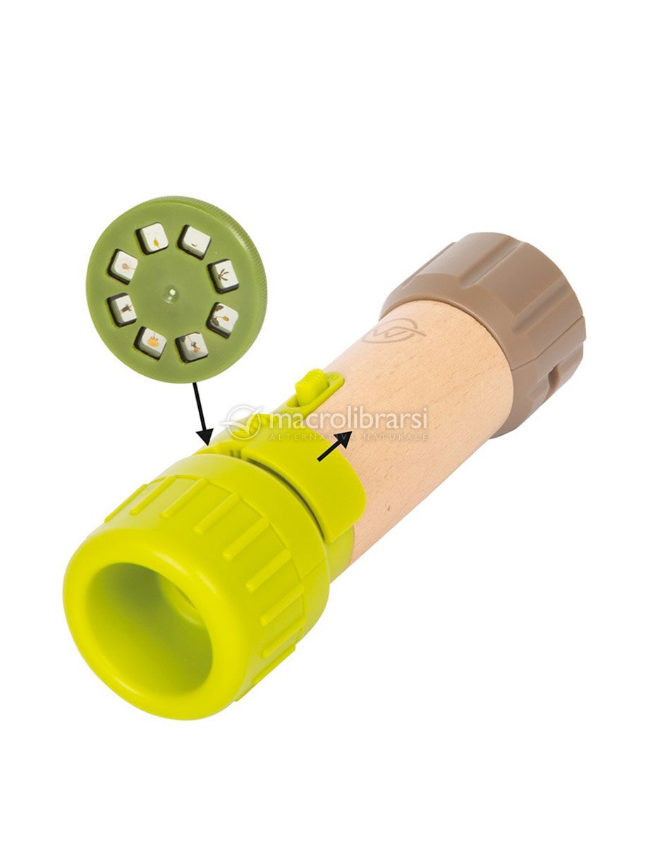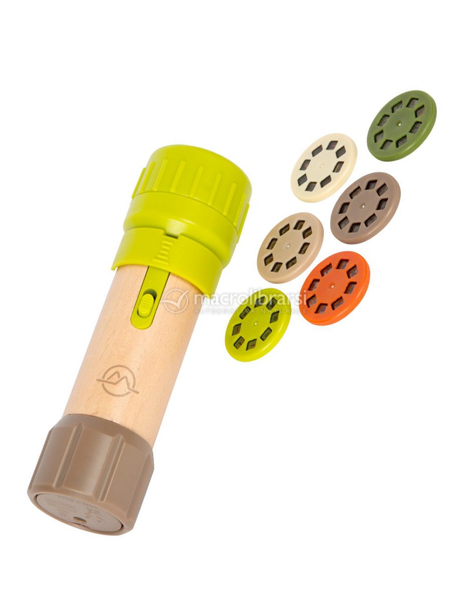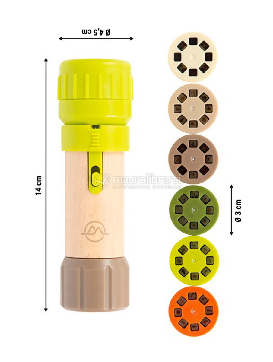 La torcia e proiettore Discover ha un' impugnatura in legno naturale, è ergonomica e piacevole al tatto, offrendo una presa sicura anche per le mani dei bambini più piccoli. Grazie al formato compatto, è facile da portare con sé: perfetta per le avventure all’aperto, durante una passeggiata serale o un campeggio in famiglia, ma anche per i momenti di gioco in casa, quando la fantasia trasforma la cameretta in un piccolo planetario o in una foresta da scoprire.
