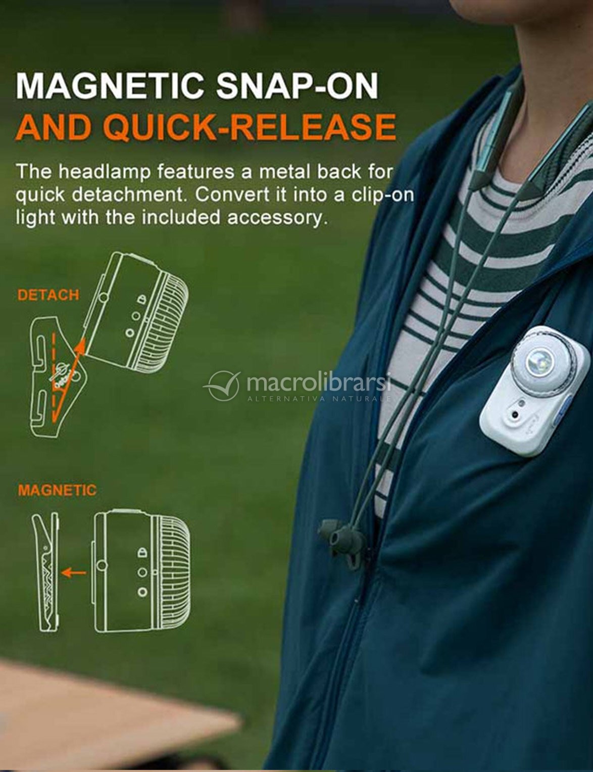Il suo punto di forza è il design multiuso: grazie al sistema di sgancio rapido magnetico, la lampada può essere staccata dal supporto frontale e utilizzata come torcia ad angolo retto o come torcia a clip tramite la clip da tasca inclusa. In questo modo puoi fissarla al torace, alla cintura, allo zaino o alle superfici metalliche come pratica luce da lavoro.