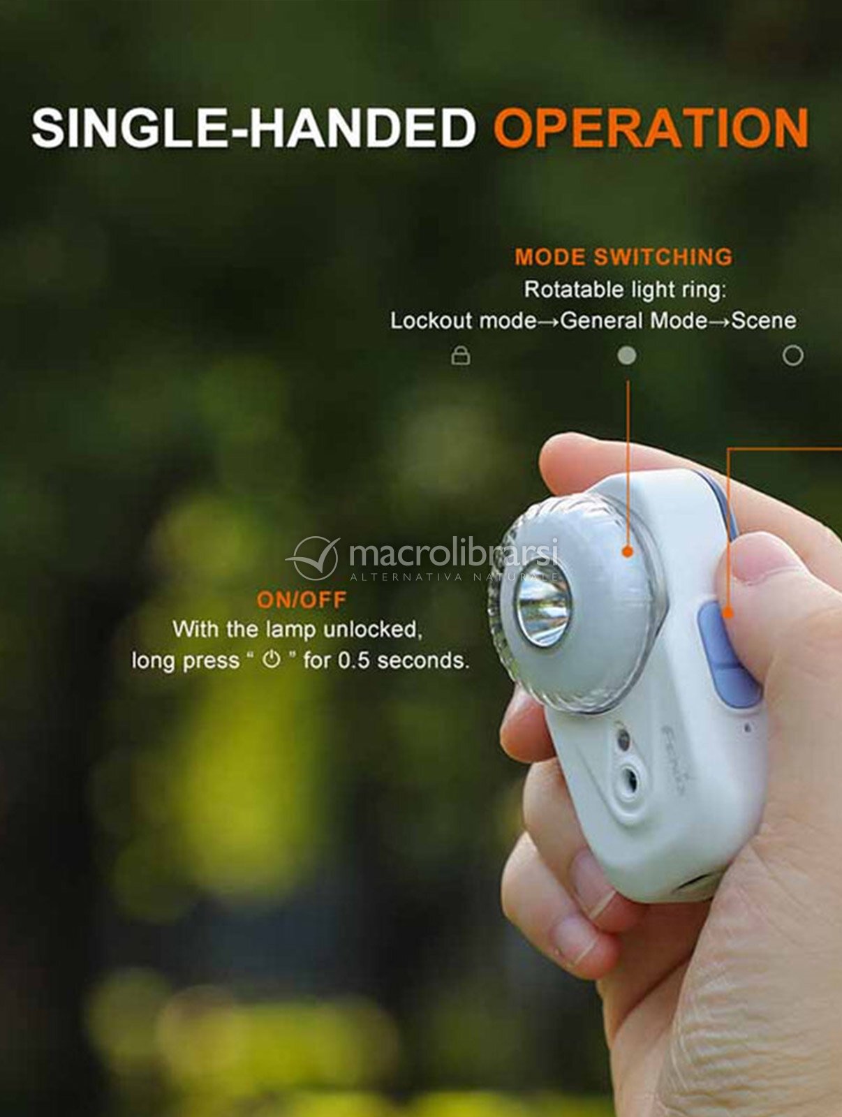 Ruota l’anello per scegliere Modalità Generale (luce bianca) o Modalità Scena (luci speciali).