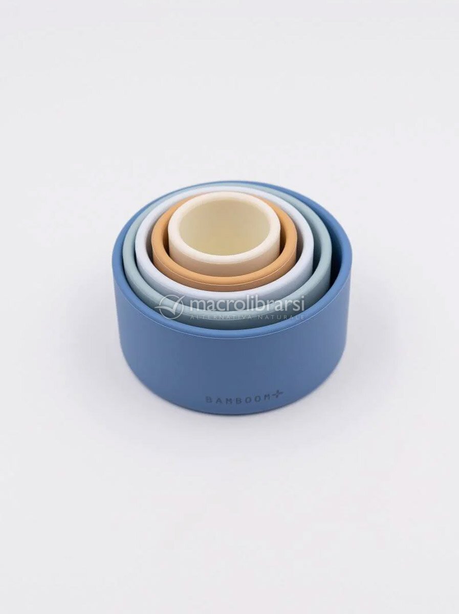 Torre composta da 5 scatole in silicone morbido, da impilare oppure infilare una dentro l'altra, in diverse tonalità di blu.