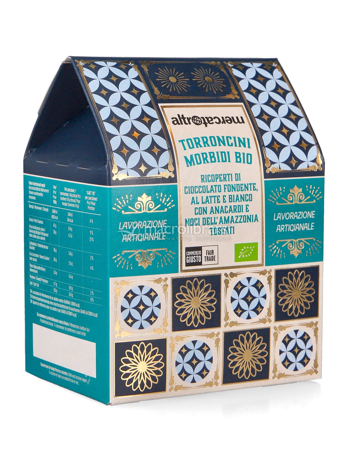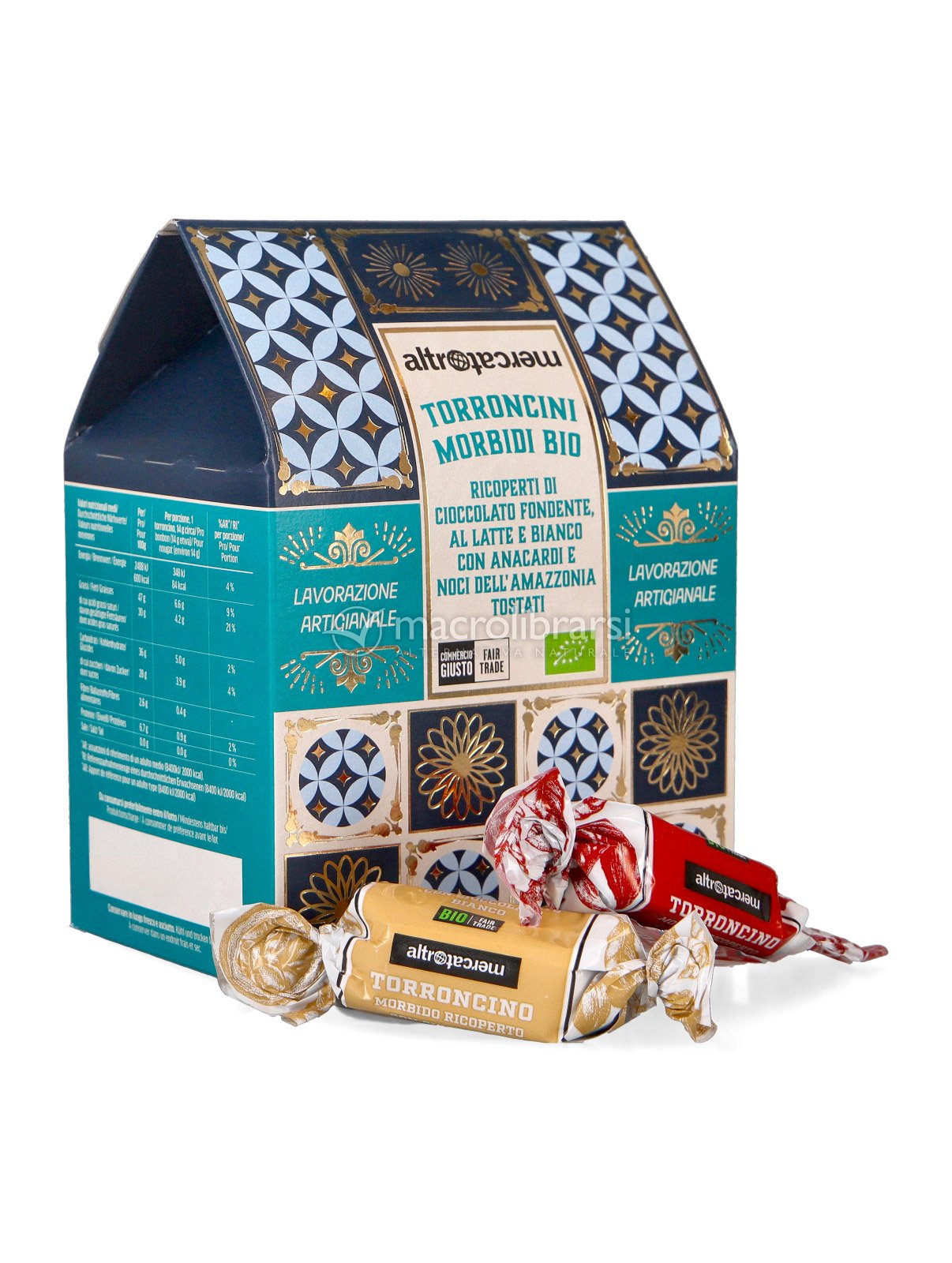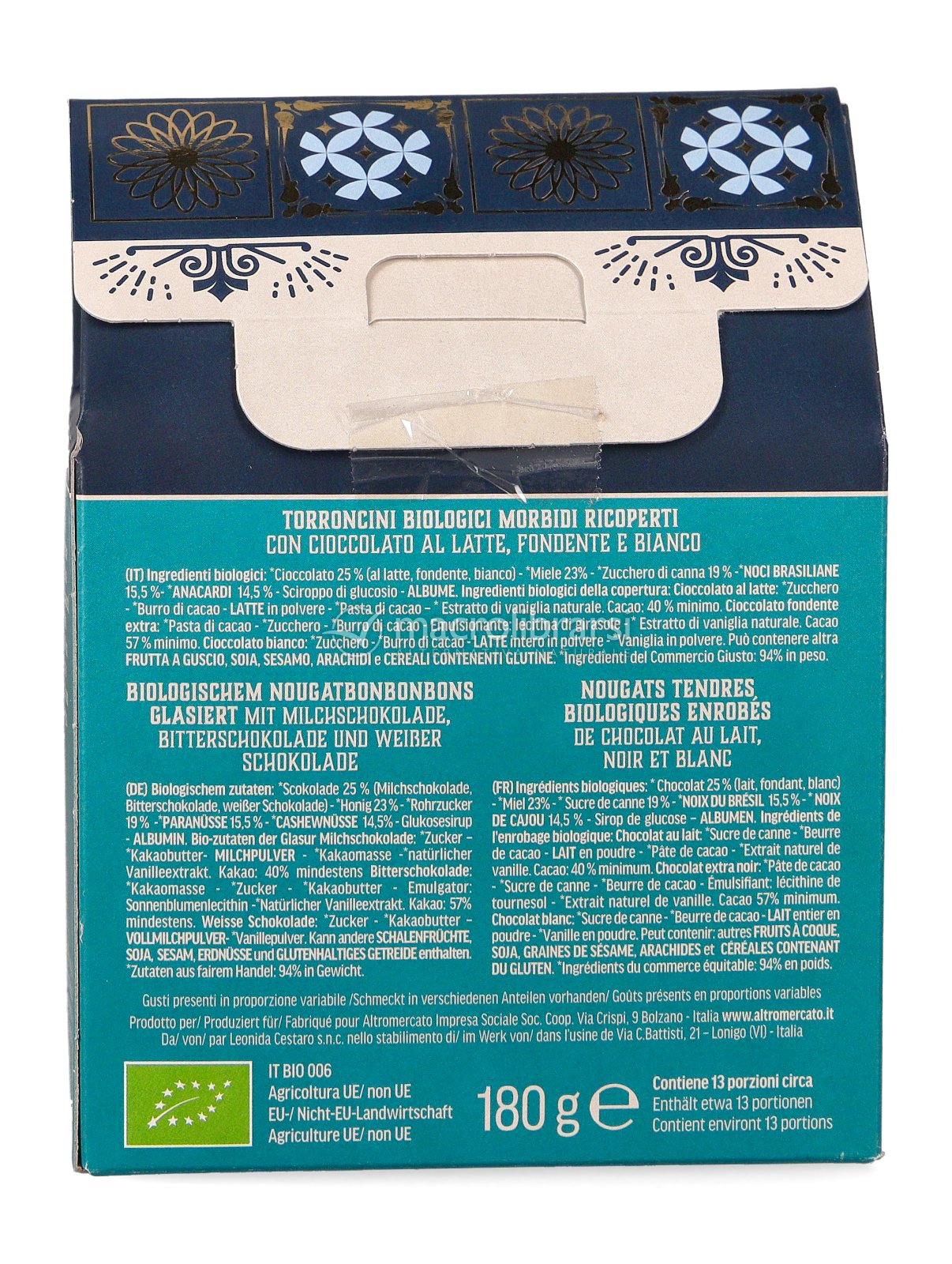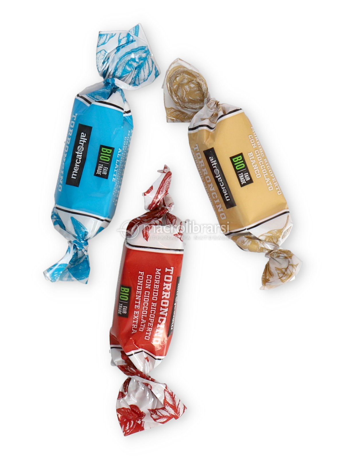 Torroncini biologici morbidi ricoperti con cioccolato la latte, fondente e bianco. Una specialità artigianale dal morbido impasto ricco di miele e frutta secca, realizzata con ingredienti da Agricoltura biologica.