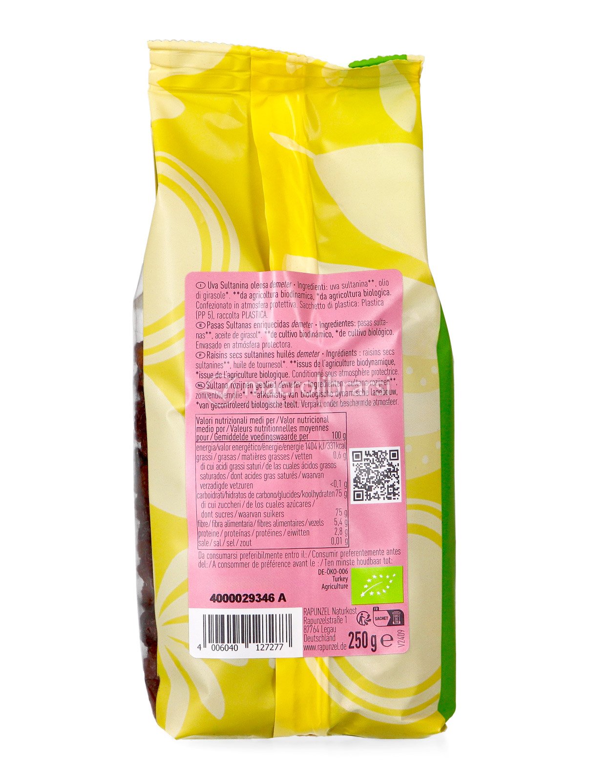 Uva sultanina confezionata di altissima qualità proposta dalla ditta biologica tedesca Rapunzel. Ideale per una prima colazione o da consumarsi come spuntino.