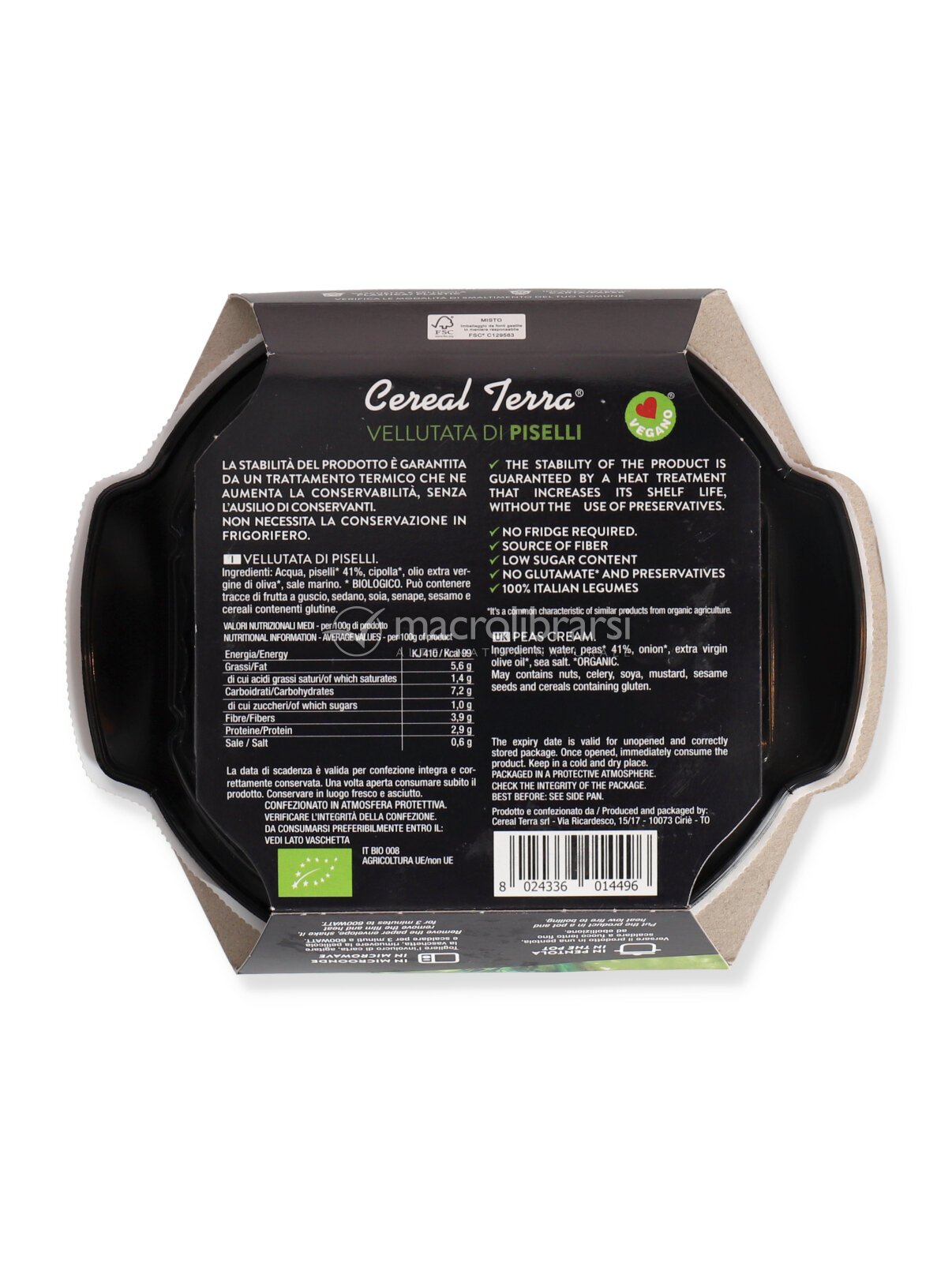 Acqua, piselli* 41%, cipolla*, olio extravergine di oliva*, sale marino*, Biologico.