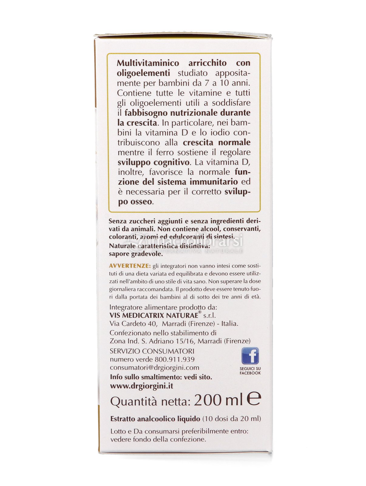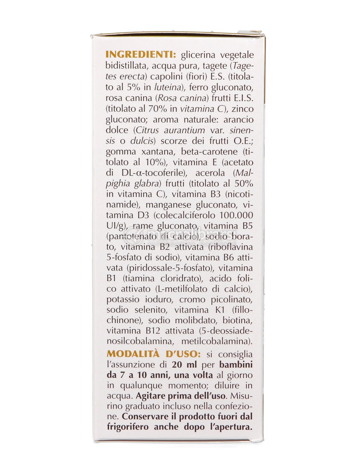 Si consiglia l’assunzione di 20 ml per bambini dai 7 ai 10 anni, diluiti in acqua, una volta al giorno, in qualunque momento. Agitare prima dell'uso. Richiudere accuratamente dopo l’utilizzo.